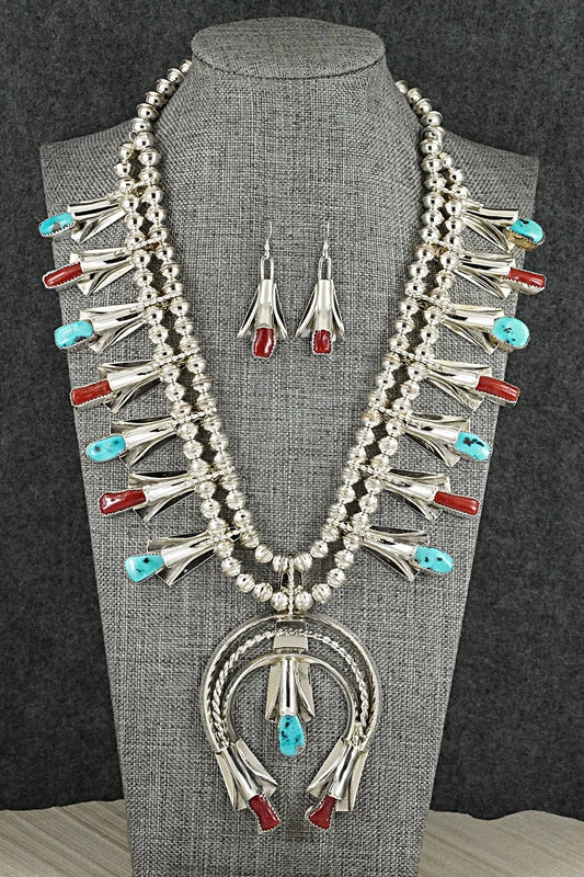 Turquoise, Coral & Sterling Silver Squash Blossom Set - Louise Yazzie