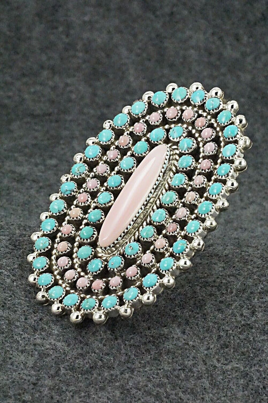 Pink Conch Shell, Turquoise & Sterling Silver Ring - Tina Jones - Size 9 (Adj)