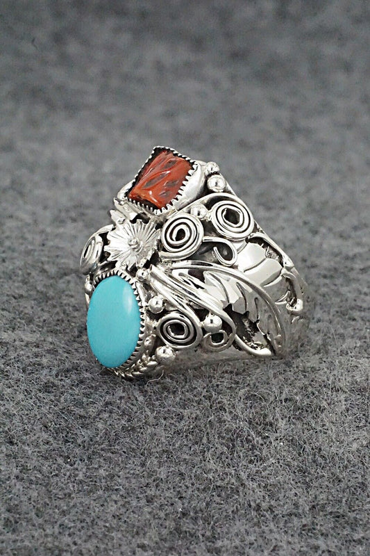 Turquoise, Coral & Sterling Silver Ring - Sarah Yazzie - Size 10