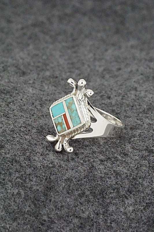 Turquoise, Coral & Sterling Silver Inlay Ring - James Manygoats - Size 7