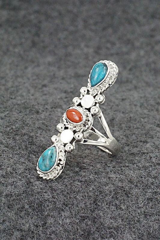 Turquoise, Coral & Sterling Silver Ring - Andrew Vandever - Size 7