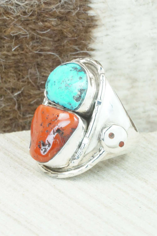 Turquoise, Coral & Sterling Silver Ring - Pauline Nelson - Size 12.75