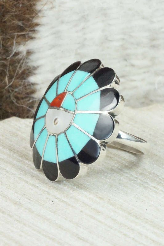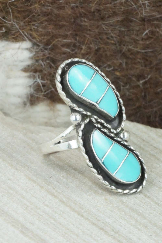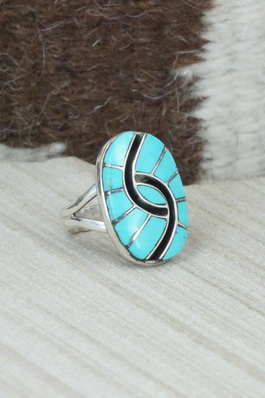 Turquoise & Sterling Silver Inlay Ring - Susie Lowsayatee - Size 7.5