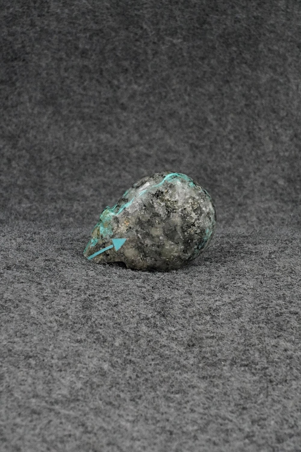 This bear with arrow inlay design Zuni fetish was carved by Abby Quam Panteah. The bottom is signed CAP.