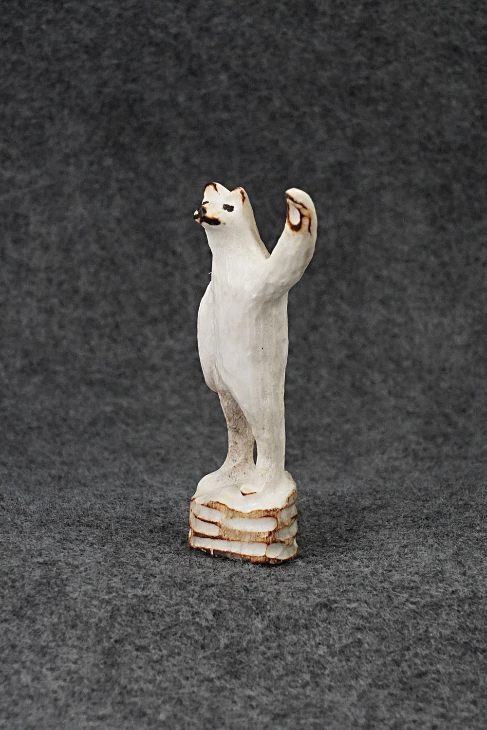 This waving bear Zuni fetish was carved by Ruben Najara. The bottom is signed R Najara, Zuni.