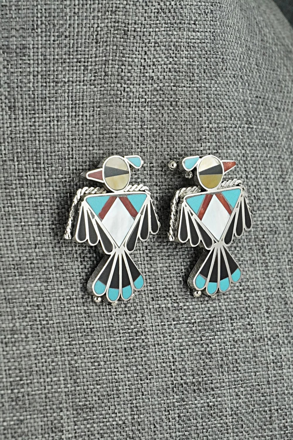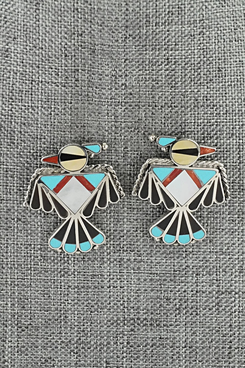 This stunning turquoise, onyx, mother of pearl, coral and bright-polish sterling silver inlay necklace, earrings and ring Thunderbird themed set was made by Zuni silversmith Adrian Wallace. The set is stamped AW and Zuni.