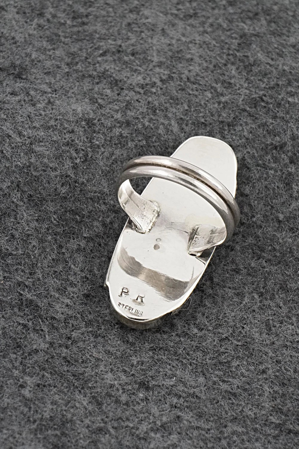 This beautiful turquoise, spiny oyster, mother of pearl and bright brushed-finish sterling silver ring was made by Navajo silversmith Priscilla Reeder. The back is stamped PR and sterling.