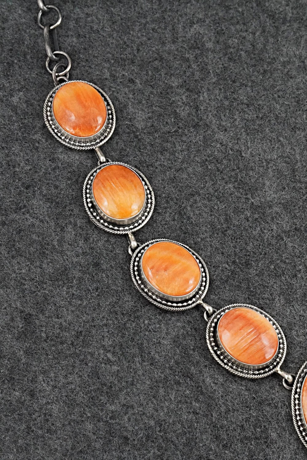 This stunning Spiny Oyster and brushed-finish sterling silver necklace and earrings set was made by Navajo silversmith Paul Livingston. The back is signed Paul Livingston and stamped sterling.