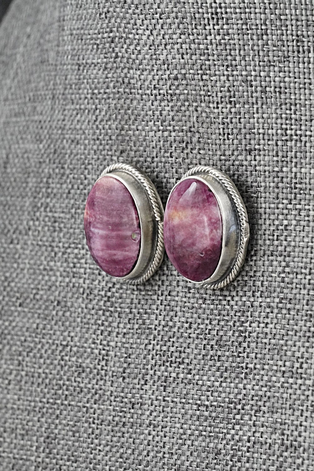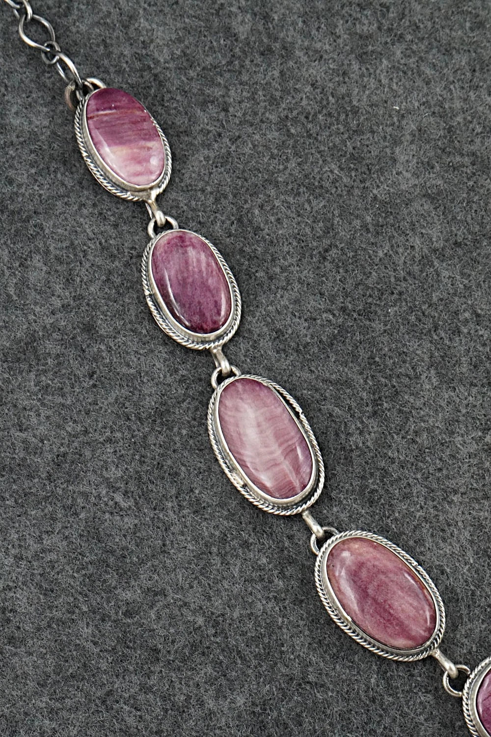 This stunning Spiny Oyster and brushed-finish sterling silver necklace and earrings set was made by Navajo silversmith Paul Livingston. The back is signed Paul Livingston and stamped sterling.