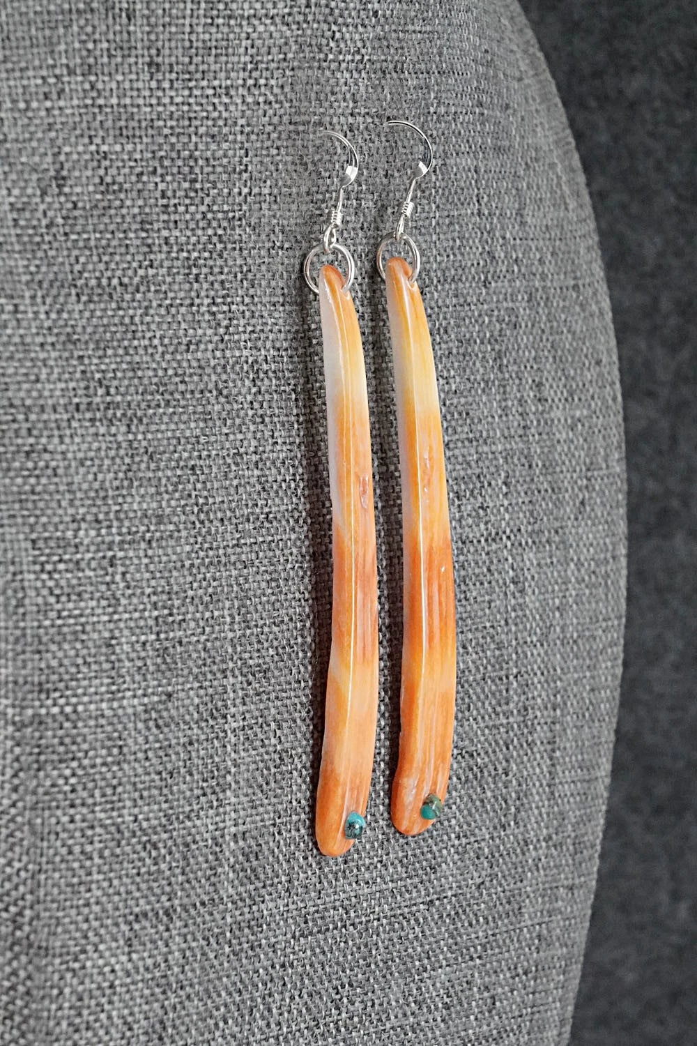 These beautiful spiny oyster, turquoise and sterling silver earrings were made by Navajo artisan Jesus Espino.