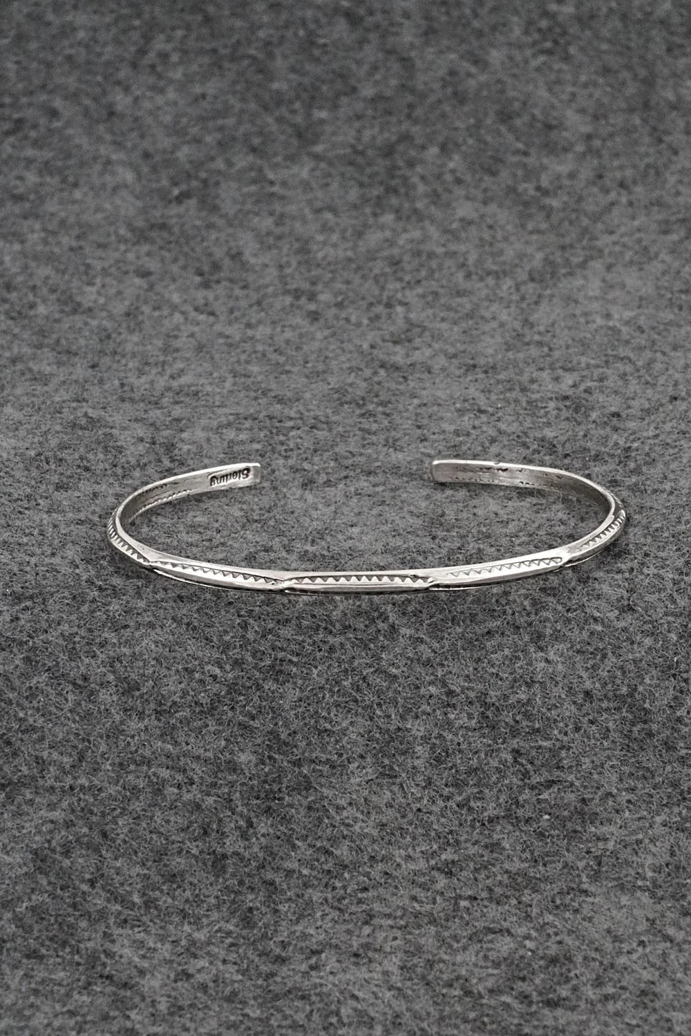This sterling silver bracelet was made by Navajo silversmith Elaine Tahe. The back is stamped sterling.