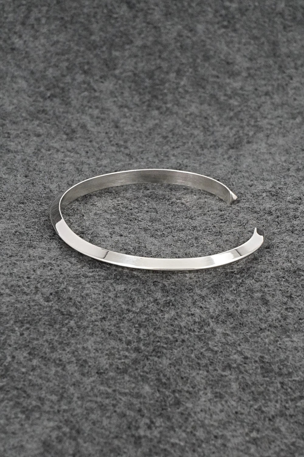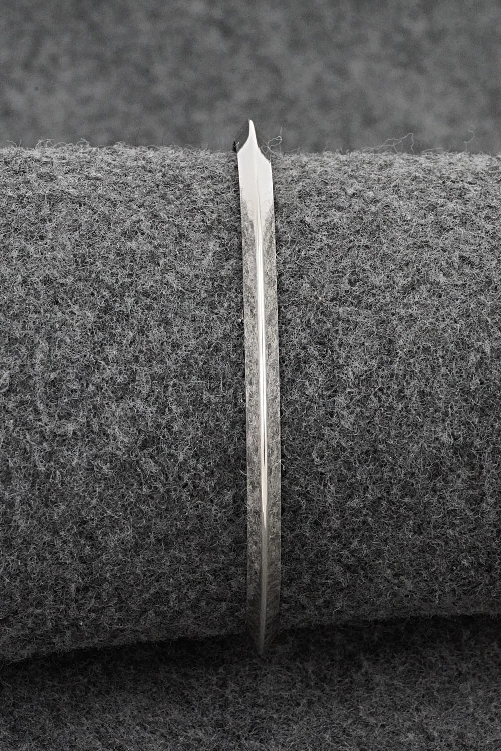 This sterling silver bracelet was made by Navajo silversmith Elaine Tahe. The back is stamped sterling.