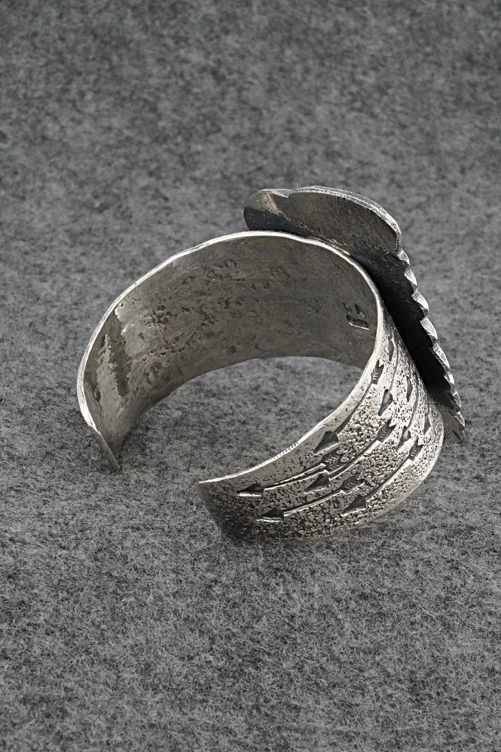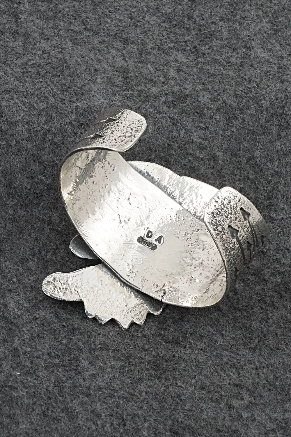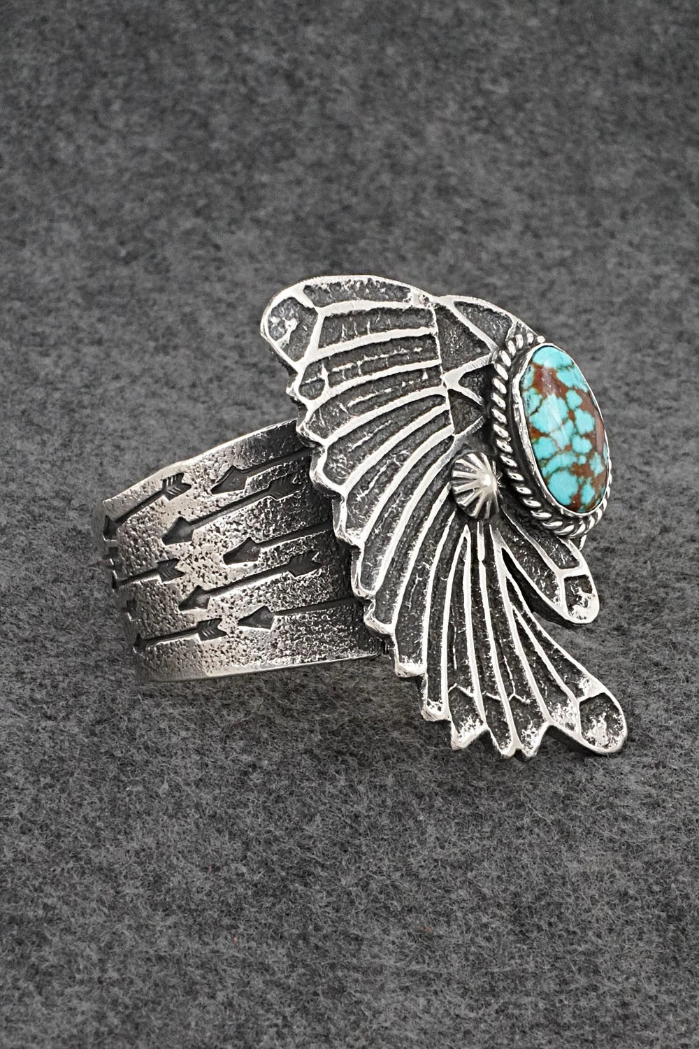 This remarkable natural kingman turquoise and bright-polish sterling silver bracelet shaped like a ceremonial headdress was made by Navajo silversmith Delbert Arviso. The back is signed DA and sterling.