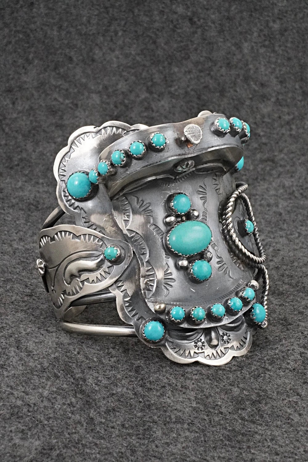 This impressive turquoise and brushed-finish sterling silver horse saddle-shaped bracelet was made by Navajo silversmith Tim Yazzie. The back is signed T. Yazzie and stamped sterling.
