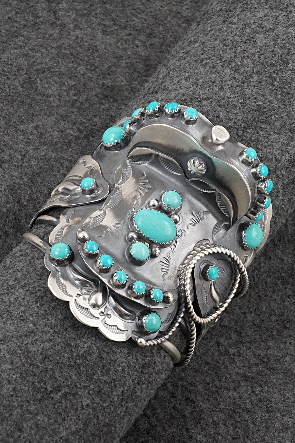 This impressive turquoise and brushed-finish sterling silver horse saddle-shaped bracelet was made by Navajo silversmith Tim Yazzie. The back is signed T. Yazzie and stamped sterling.