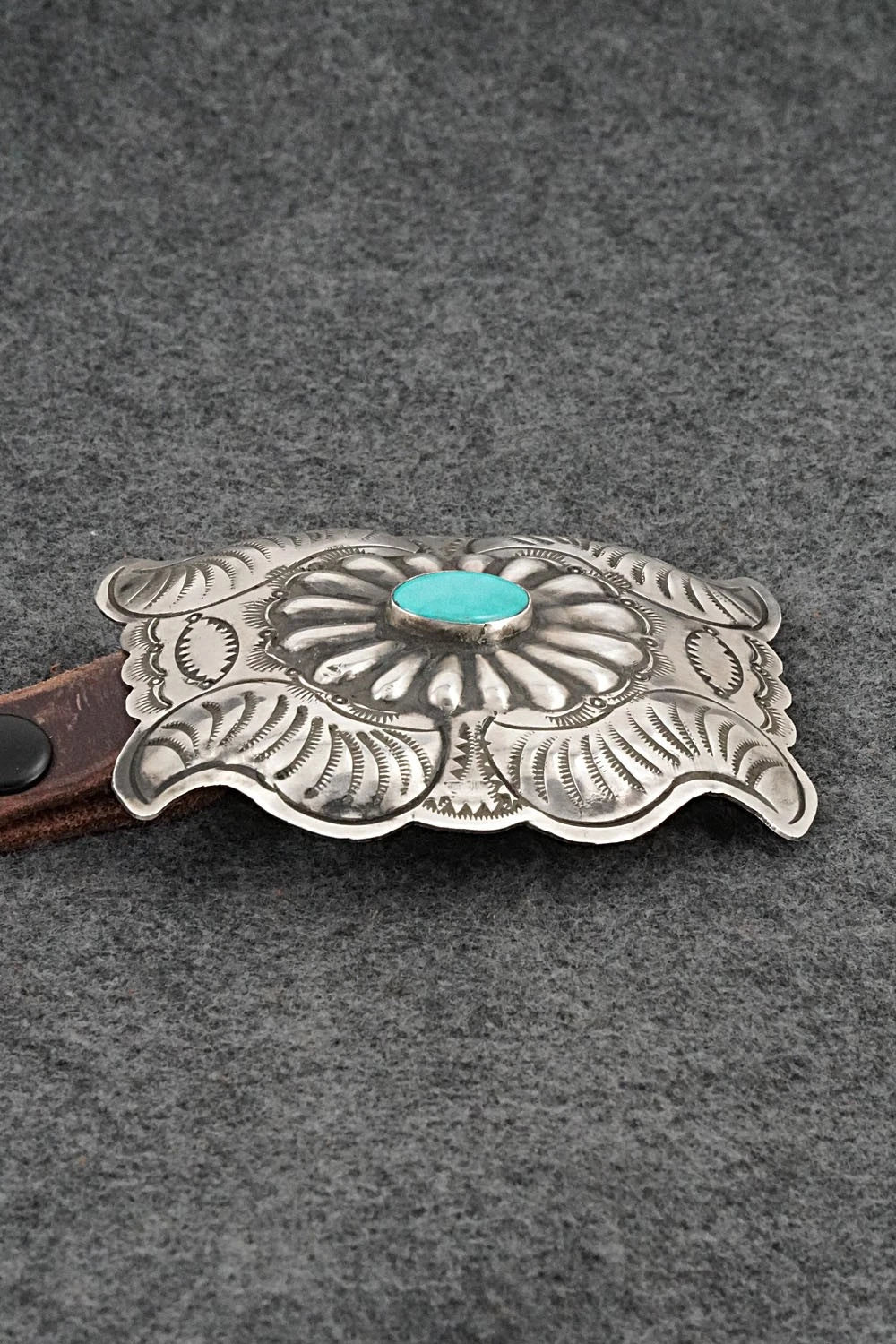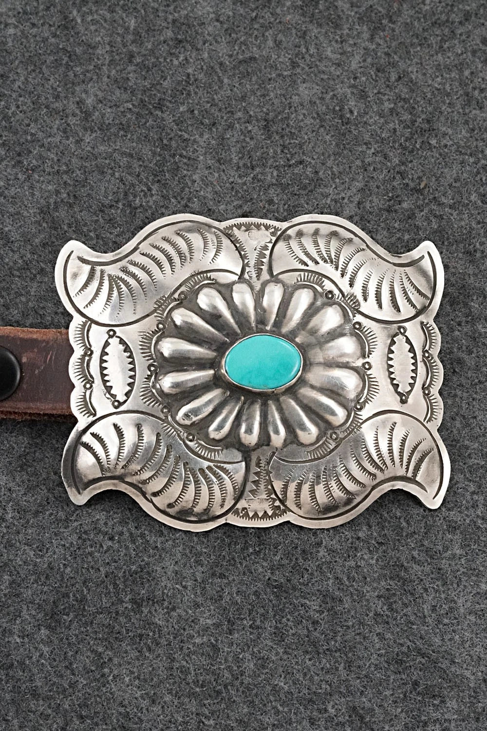 This impressive turquoise, brushed-finish sterling silver and leather concho belt was made by Navajo silversmith Marilyn Ramone. The back of the buckle is stamped MR and sterling.