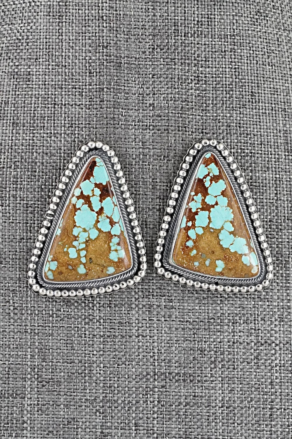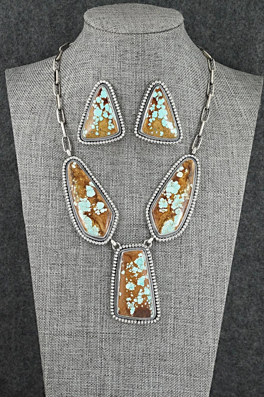 This impressive #8 turquoise and brushed-finish sterling silver necklace and earrings set was made by Navajo silversmith Darrin Livingston. The back is signed Darrin Livingston and stamped sterling.