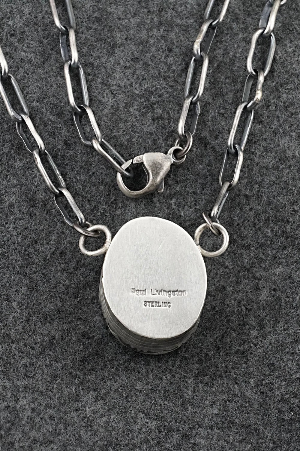 This natural Kingman turquoise and brushed-finish sterling silver necklace was made by Navajo silversmith Paul Livingston. The back is signed Paul Livingston and stamped sterling.