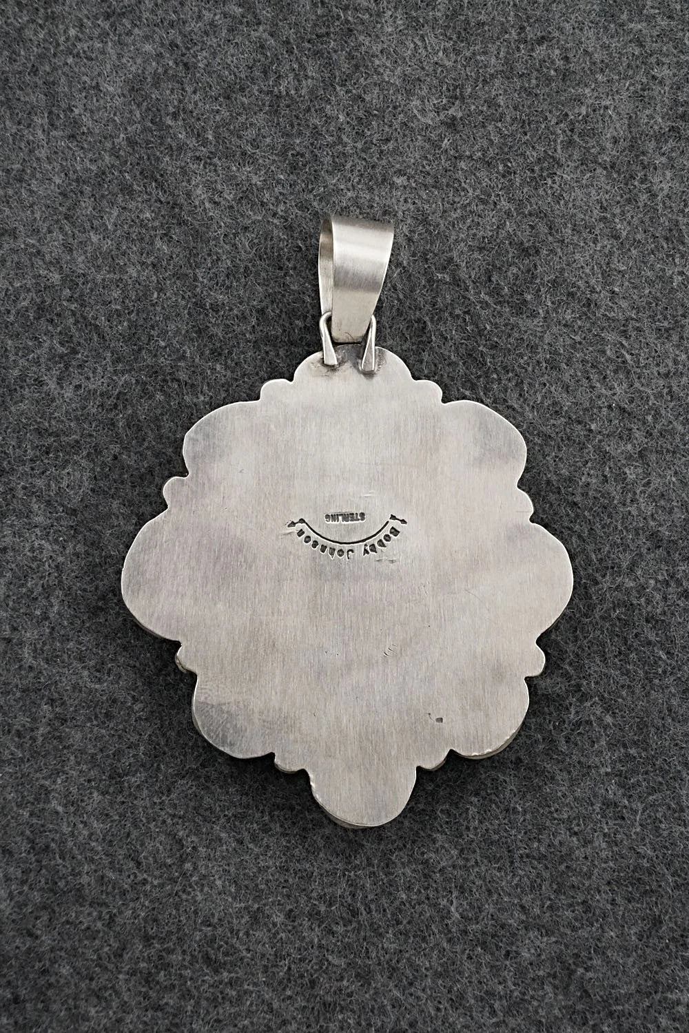 This beautiful natural Fox turquoise and brushed-finish sterling silver pendant was made by Navajo silversmith Bobby Johnson. The back is signed and stamped sterling.