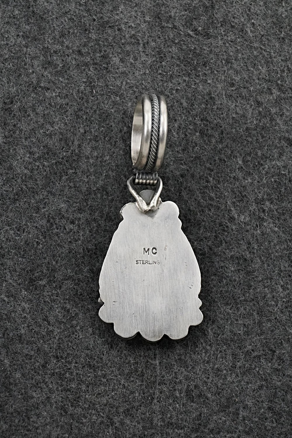 This stunning natural Kingman turquoise and brushed-finish sterling silver pendant was made by Navajo silversmith Michael Calladitto. The back is signed MC and stamped sterling.