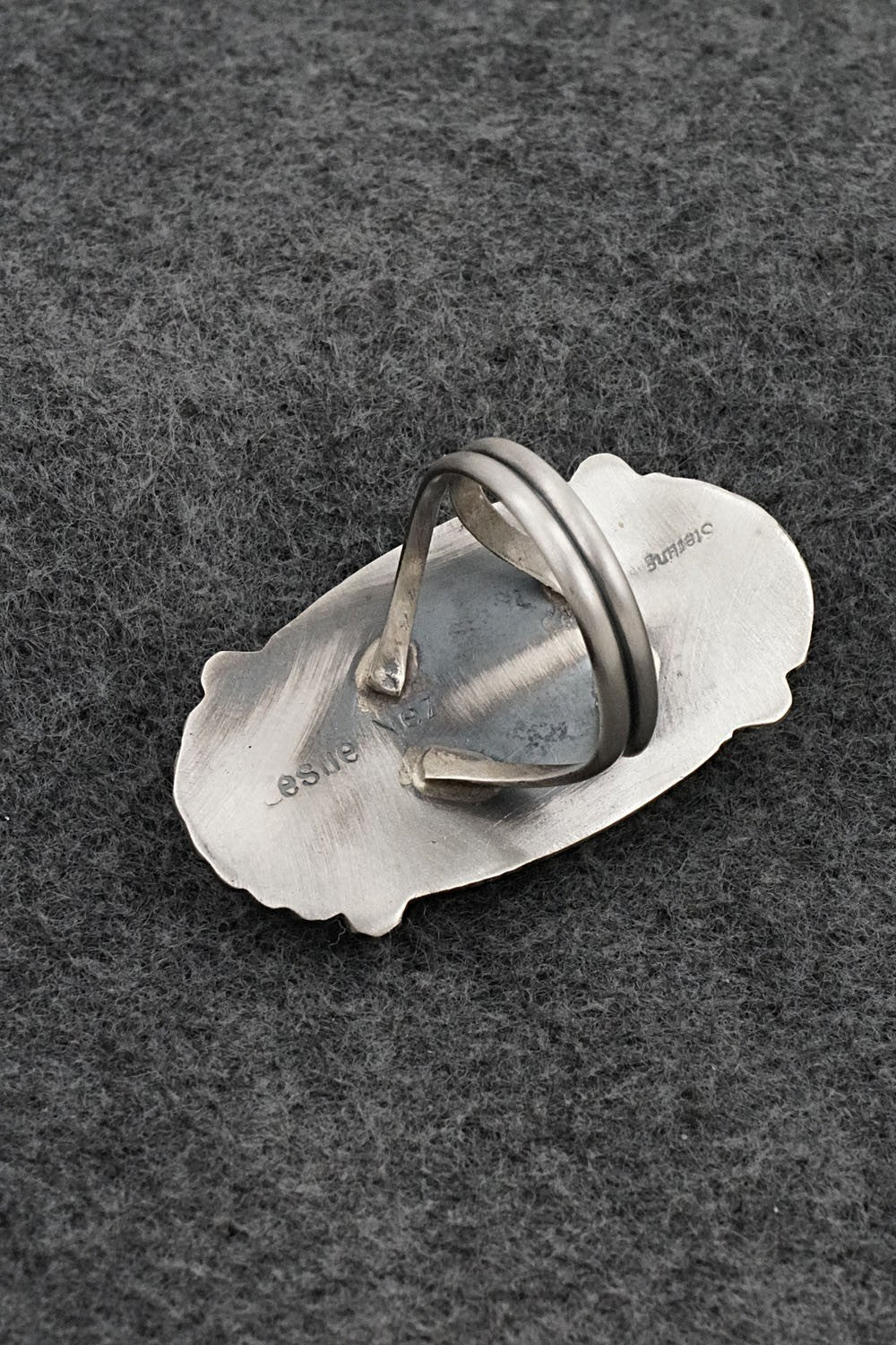 This beautiful turquoise and brushed-finish sterling silver ring was made by Navajo silversmith Leslie Nez. The back is signed and stamped sterling.