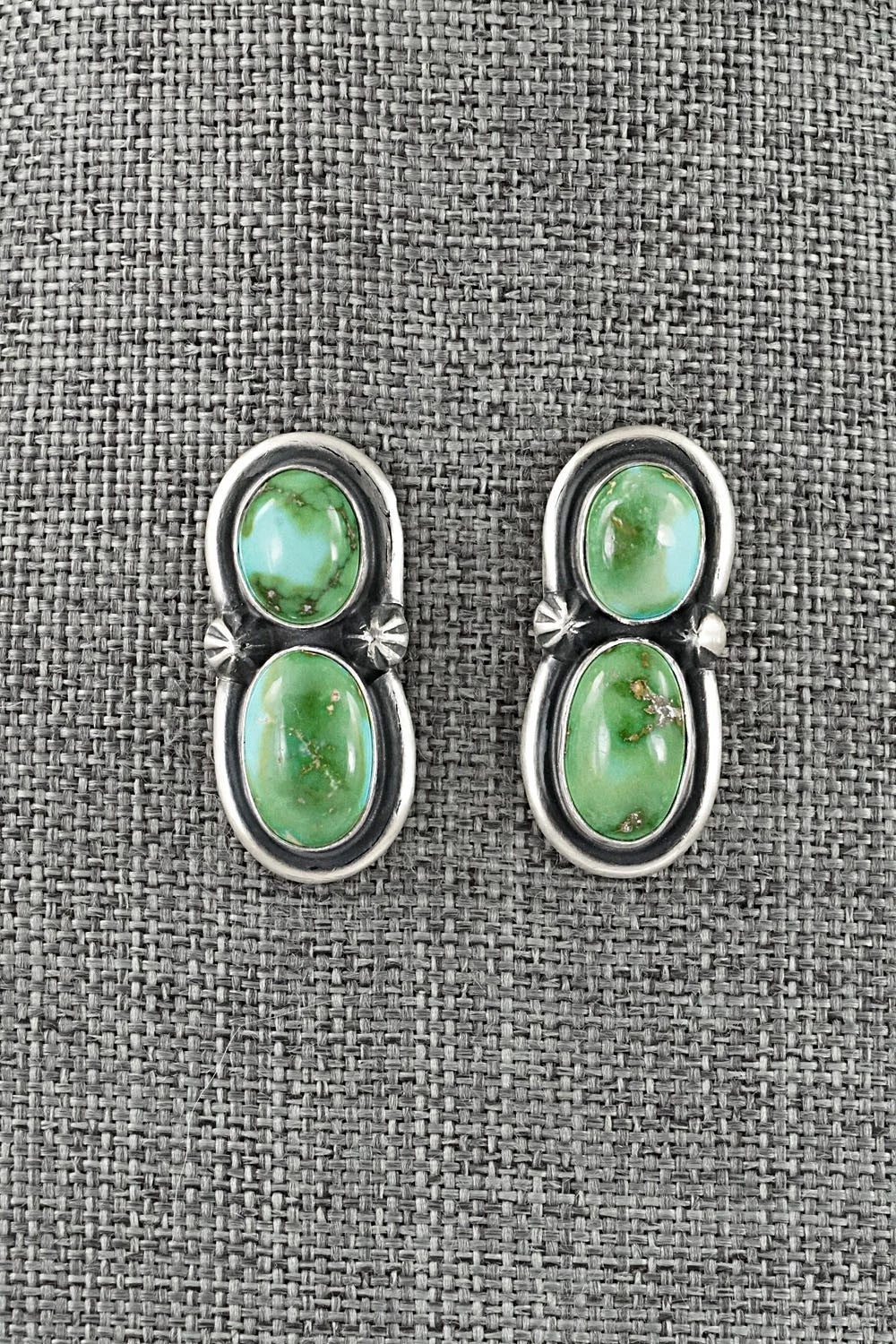 This stunning Sonoran Mountain turquoise and brushed-finish sterling silver squash blossom necklace and earrings set was made by Navajo silversmith Darrin Livingston. The back of the naja is signed Darrin Livingston and stamped Sterling.