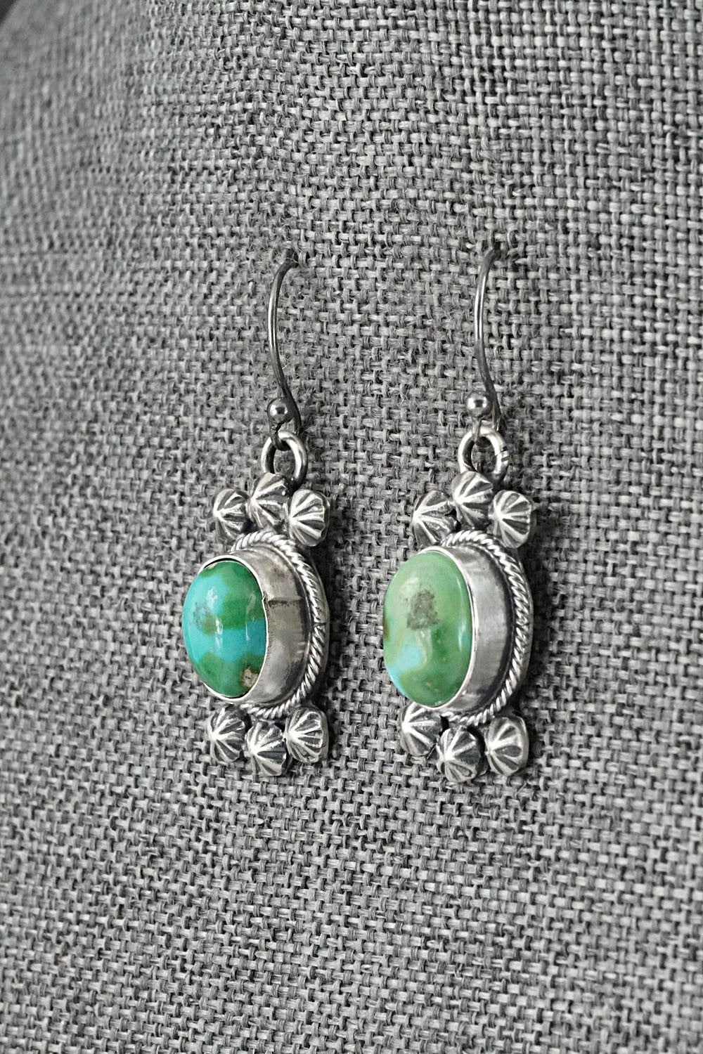 This stunning Sonoran Mountain turquoise and brushed-finish sterling silver squash blossom necklace and earrings set was made by Navajo silversmith Darrin Livingston. The back of the naja is signed Darrin Livingston and stamped Sterling.