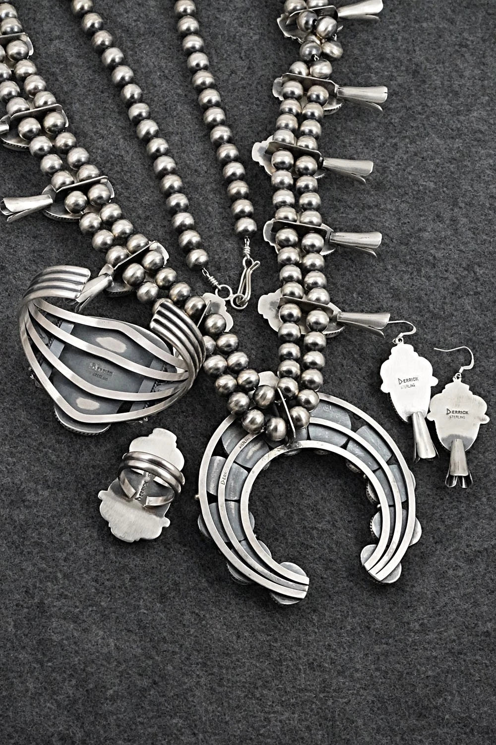 This amazing squash blossom set featuring Sleeping Beauty turquoise and brushed-finish sterling silver necklace, earrings, ring and bracelet was made by Navajo silversmith Derrick Gordon. The set is signed Derrick and sterling.