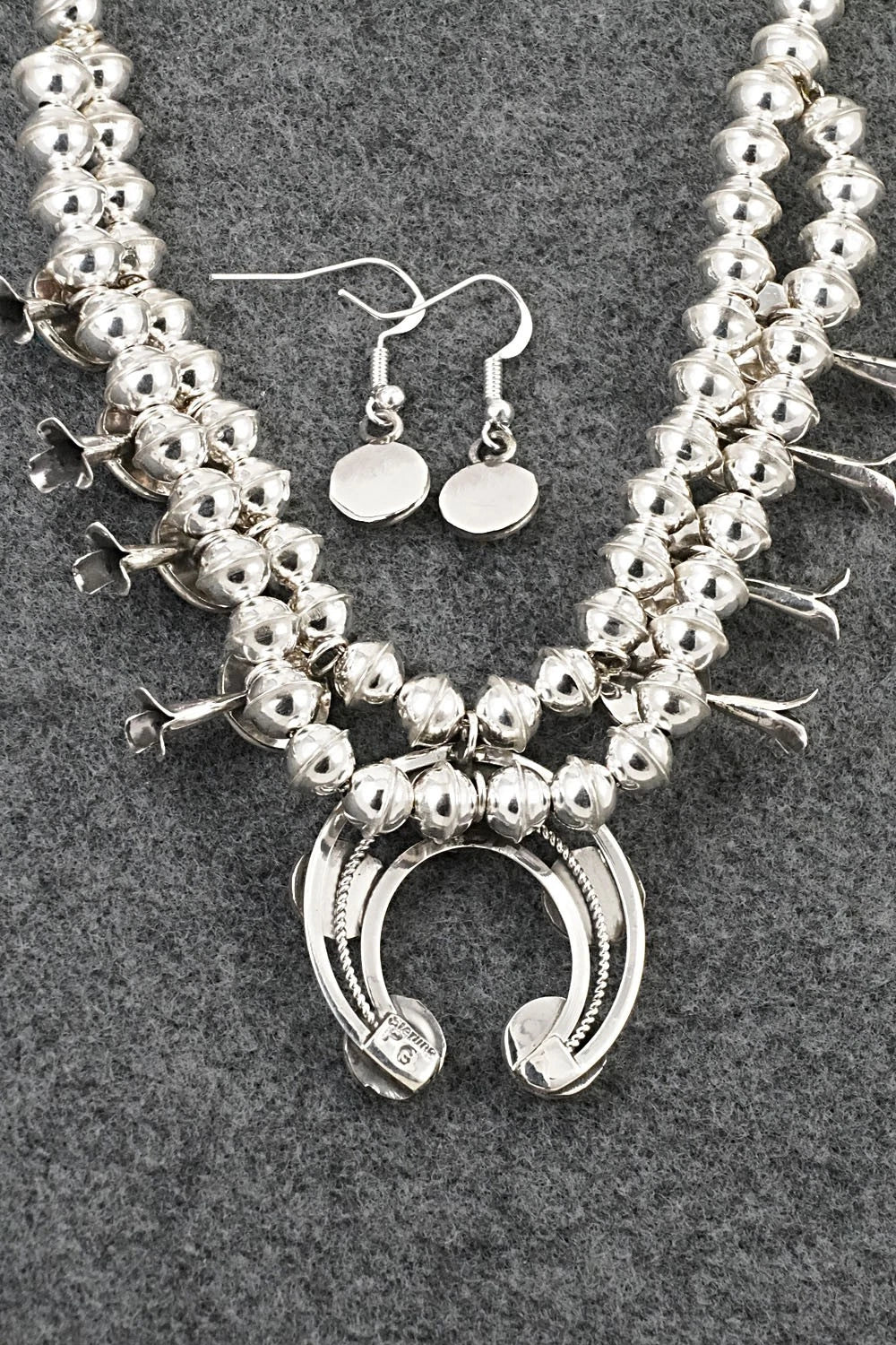 This beautiful turquoise and bright-polish sterling silver squash blossom necklace and earrings set was made by Navajo silversmith Phil Garcia. The back of the naja is signed PG and stamped Sterling.