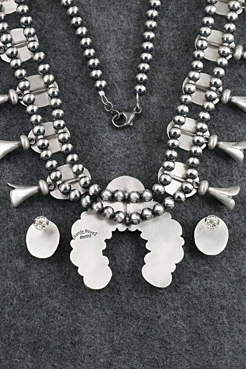 This stunning Sonoran Mountain turquoise and brushed-finish sterling silver squash blossom necklace and earrings set was made by Navajo silversmith Randy Boyd. The back of the naja is signed Randy Boyd and stamped Sterling.
