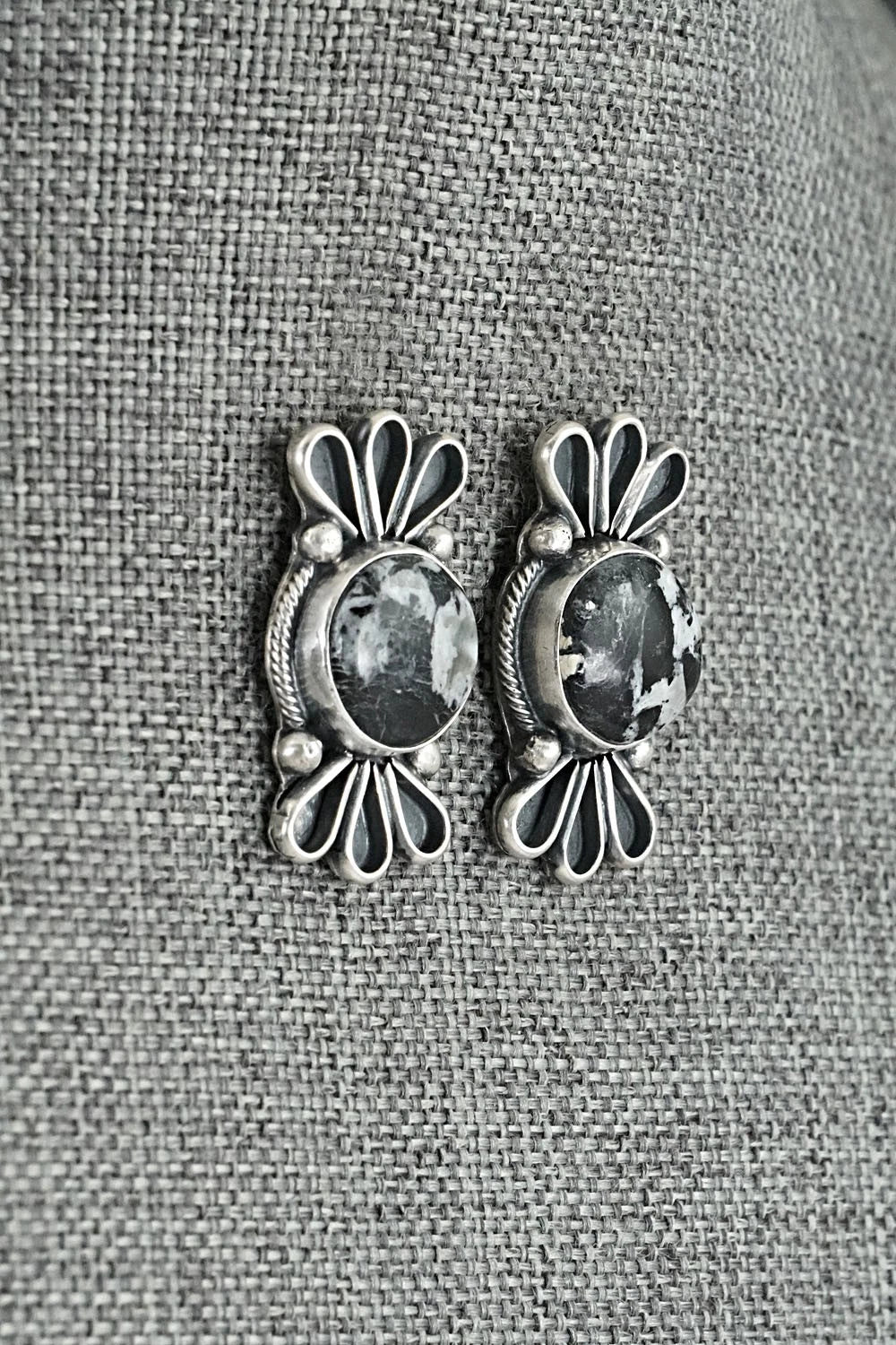 This stunning White Buffalo and brushed-finish sterling silver squash blossom necklace and earrings set was made by Navajo silversmith Darrin Livingston. The back of the naja is signed Darrin Livingston and stamped Sterling.
