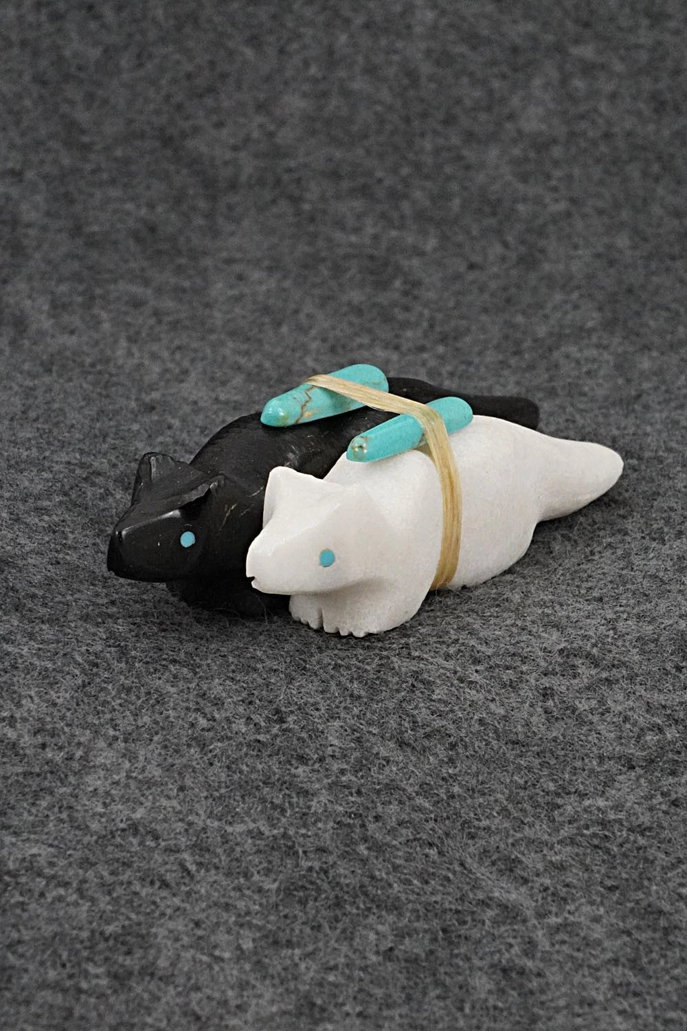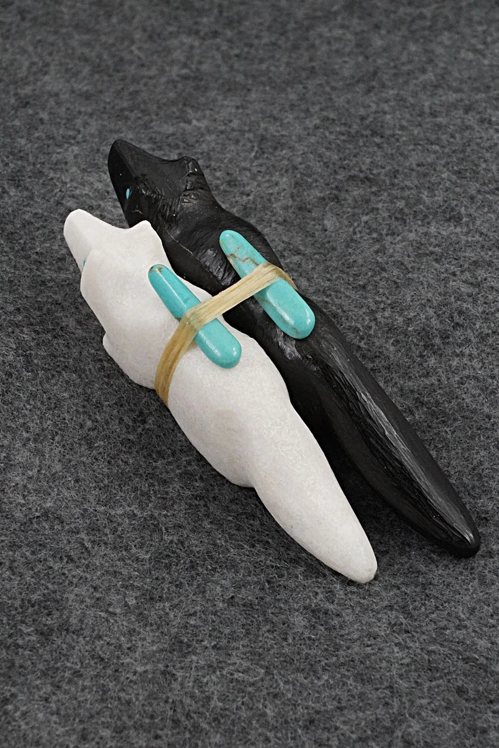 This Zuni fetish featuring two wolves with stone offering was carved by Herb Halate. The bottom is signed HH, Zuni.