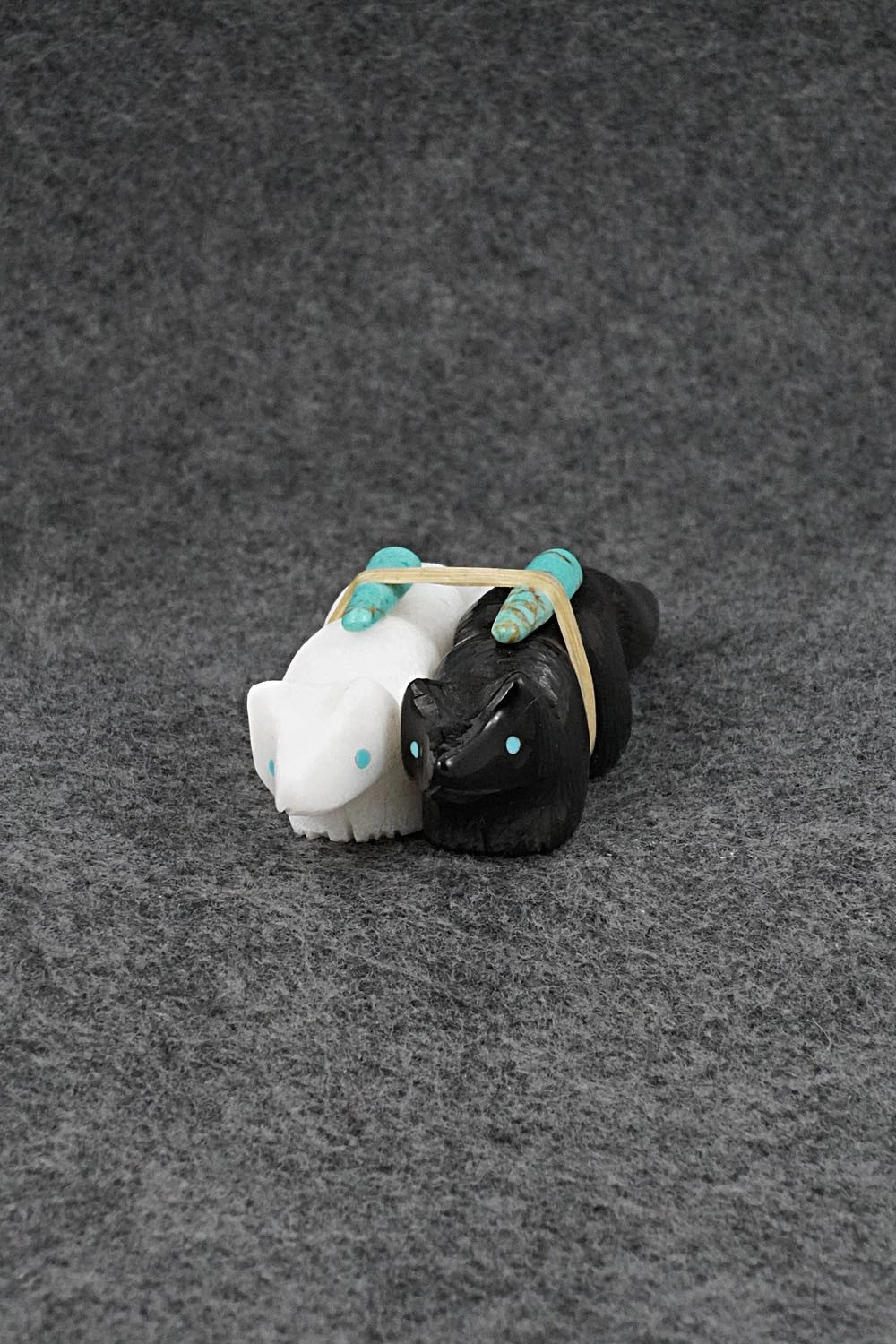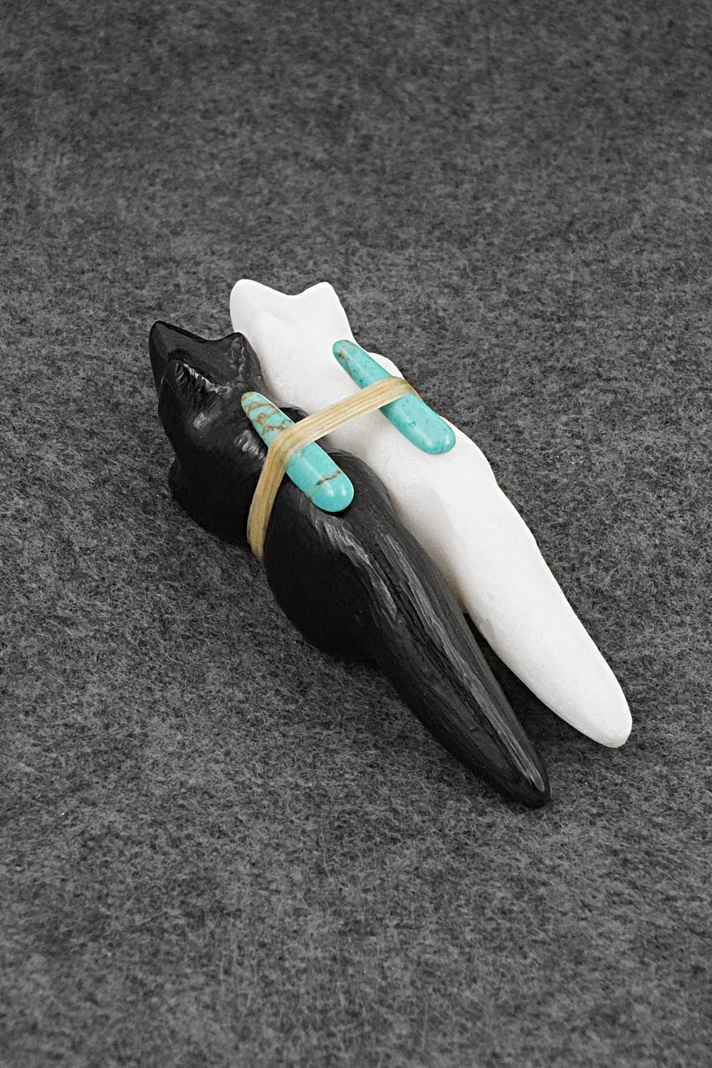 This Zuni fetish featuring two wolves was carved by Herb Halate. The bottom is signed HH and Zuni.