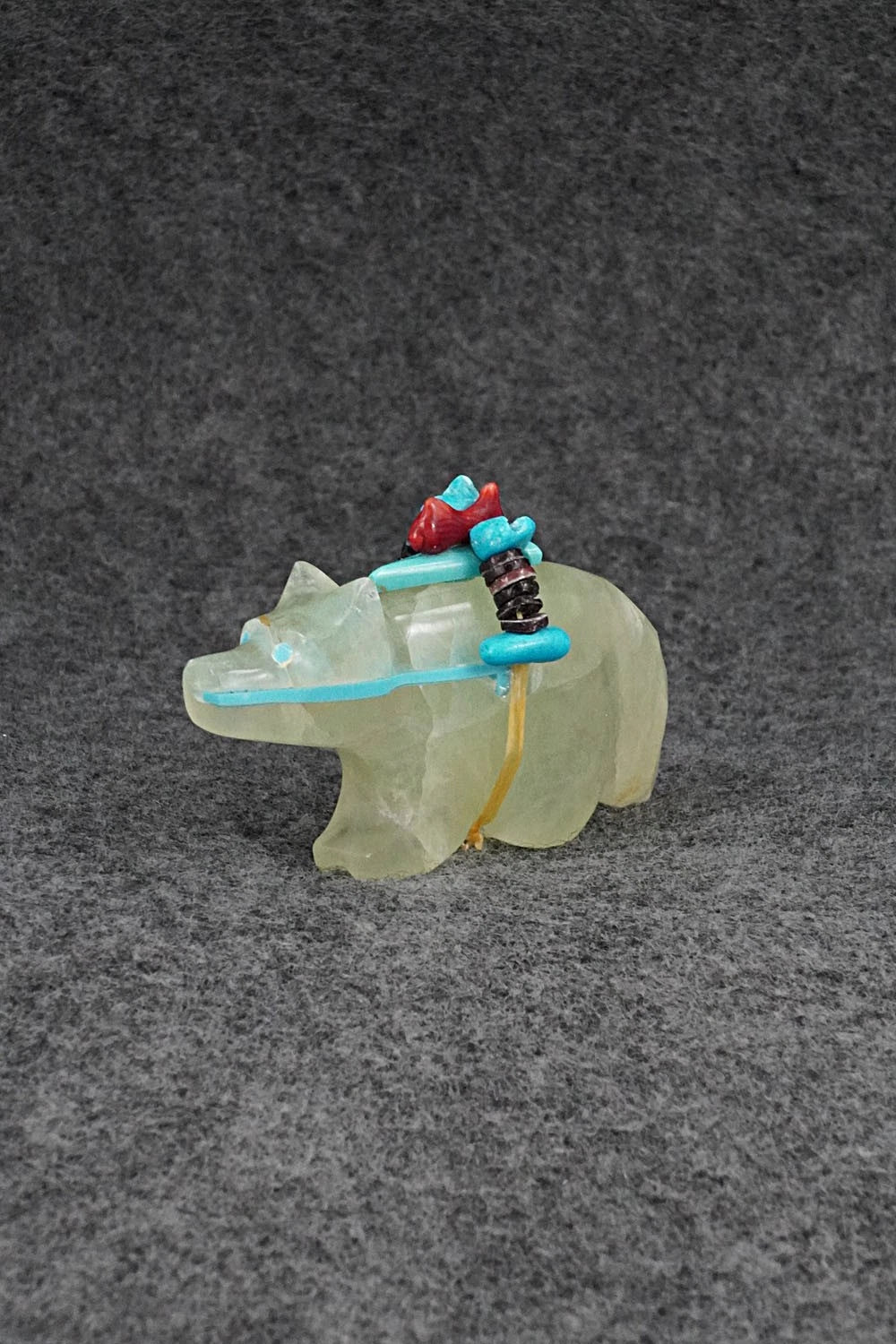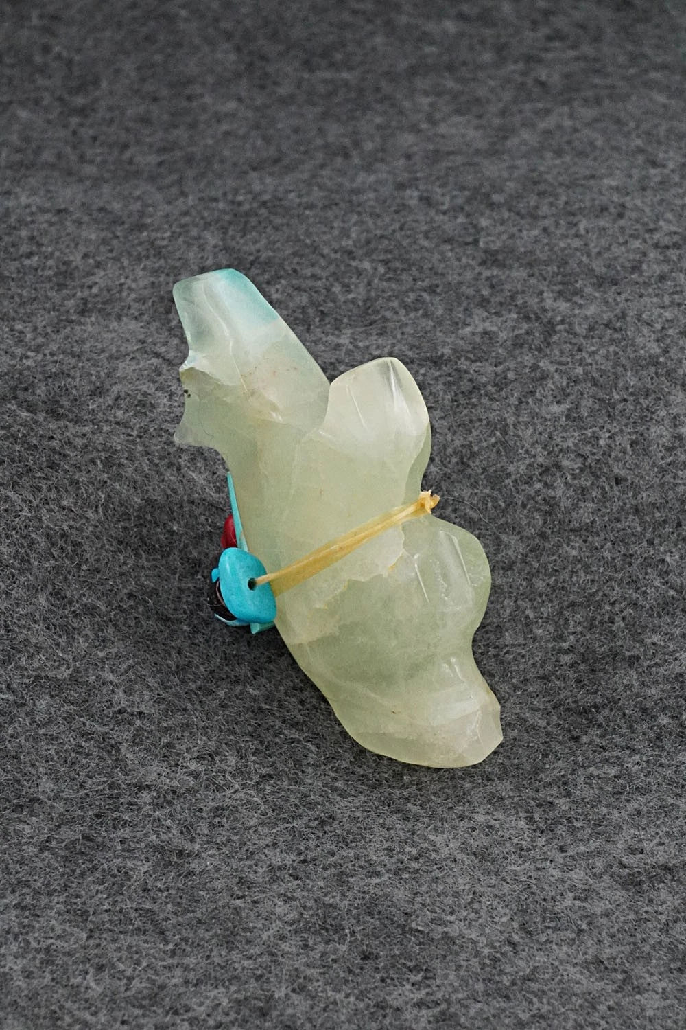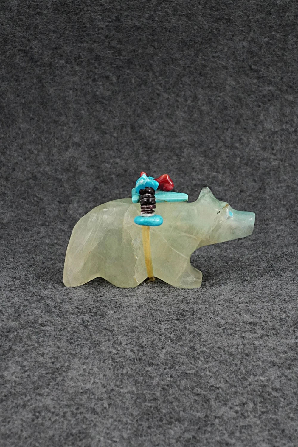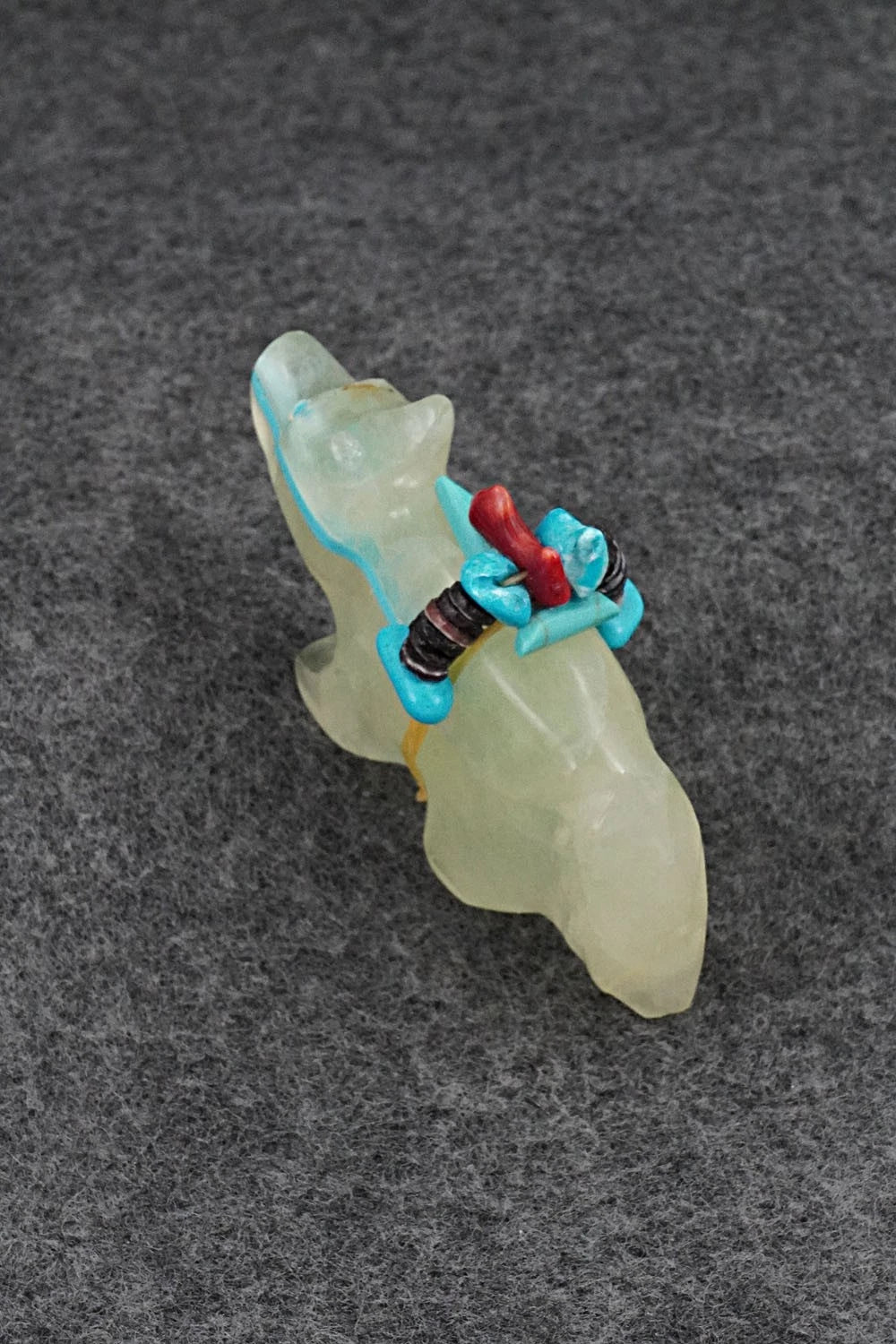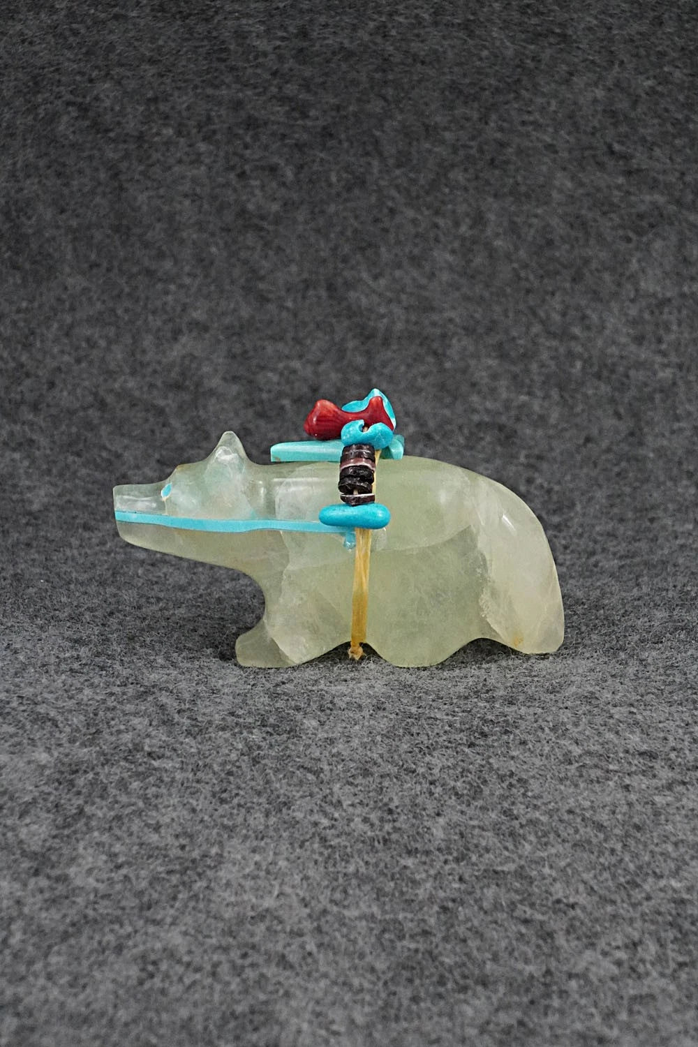 This wolf Zuni fetish with arrowhead offering was carved by Rodney Laiwakete. The bottom is signed.