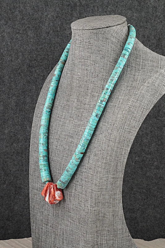 Turquoise, Spiny Oyster & Sterling Silver Necklace 21"- Lupe Lovato