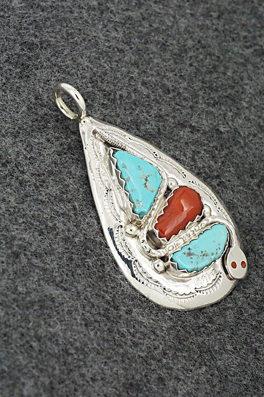 Turquoise, Coral and Sterling Silver Pendant - Joy Calavaza