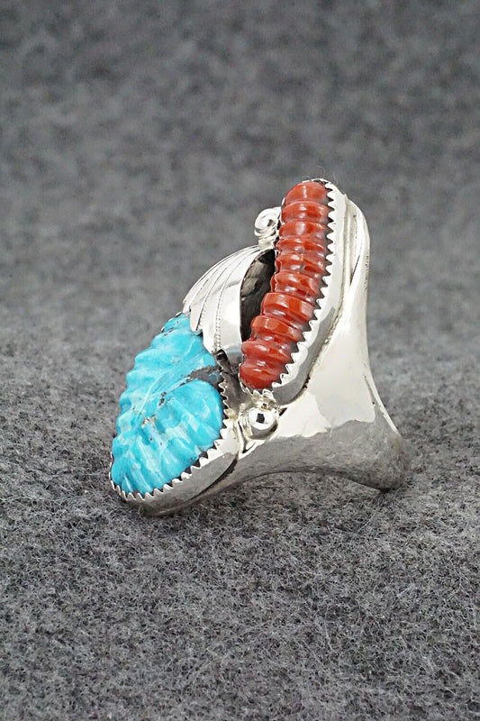 Turquoise, Coral & Sterling Silver Ring - Lyolita Tsattie - Size 11.5