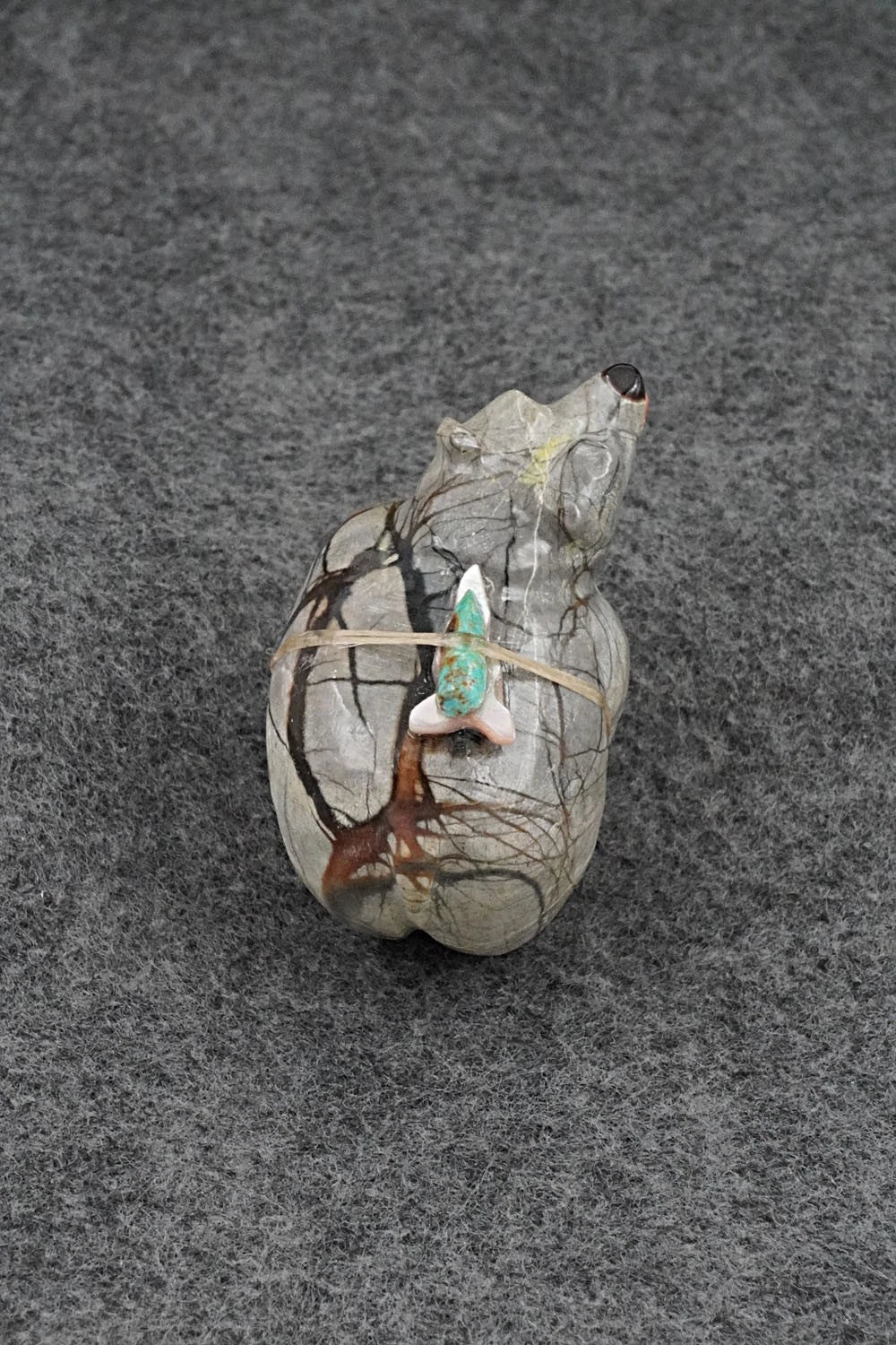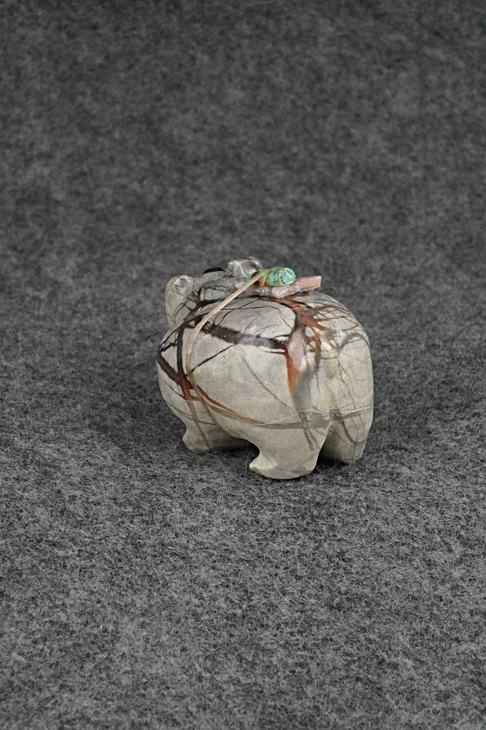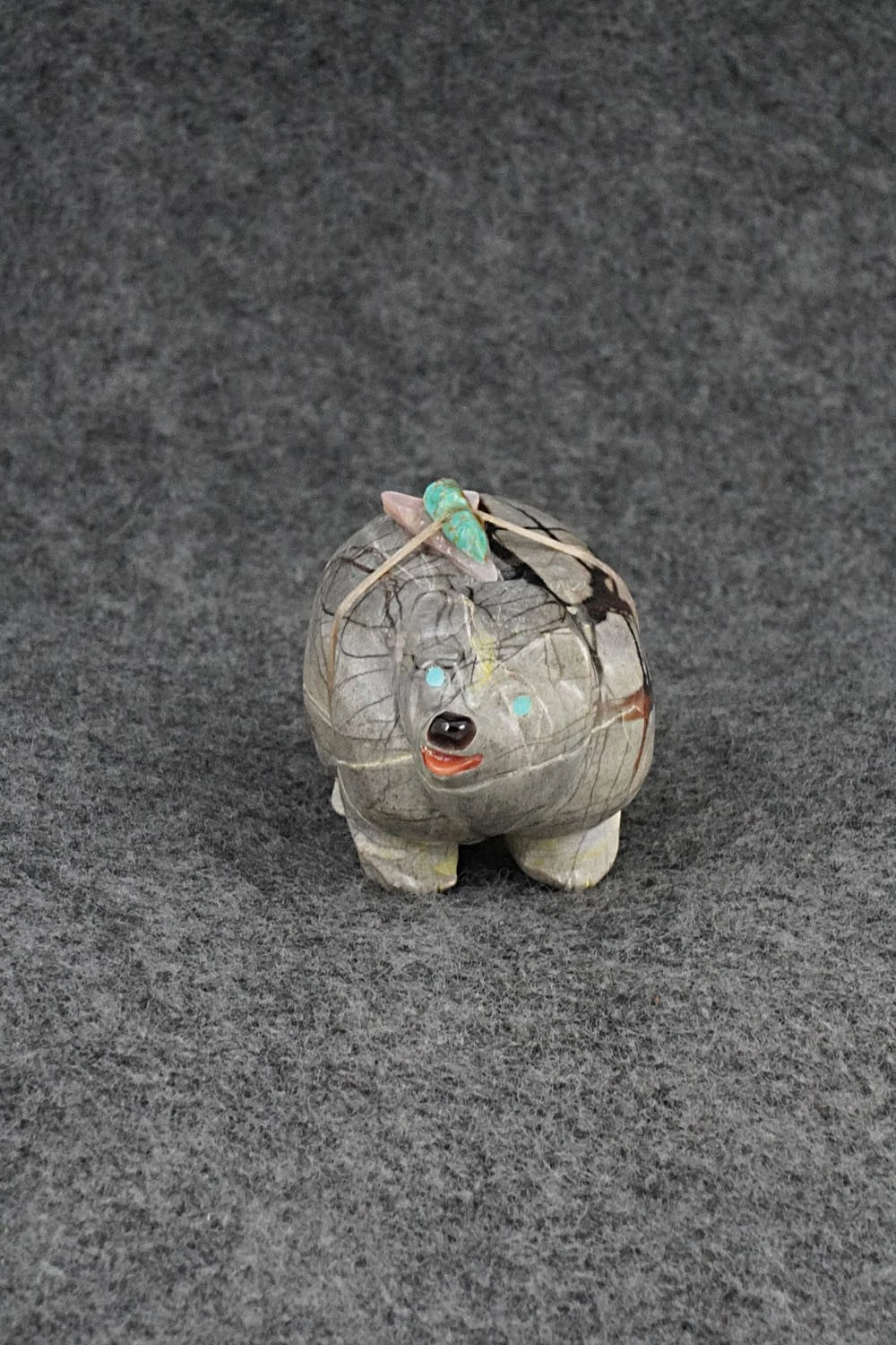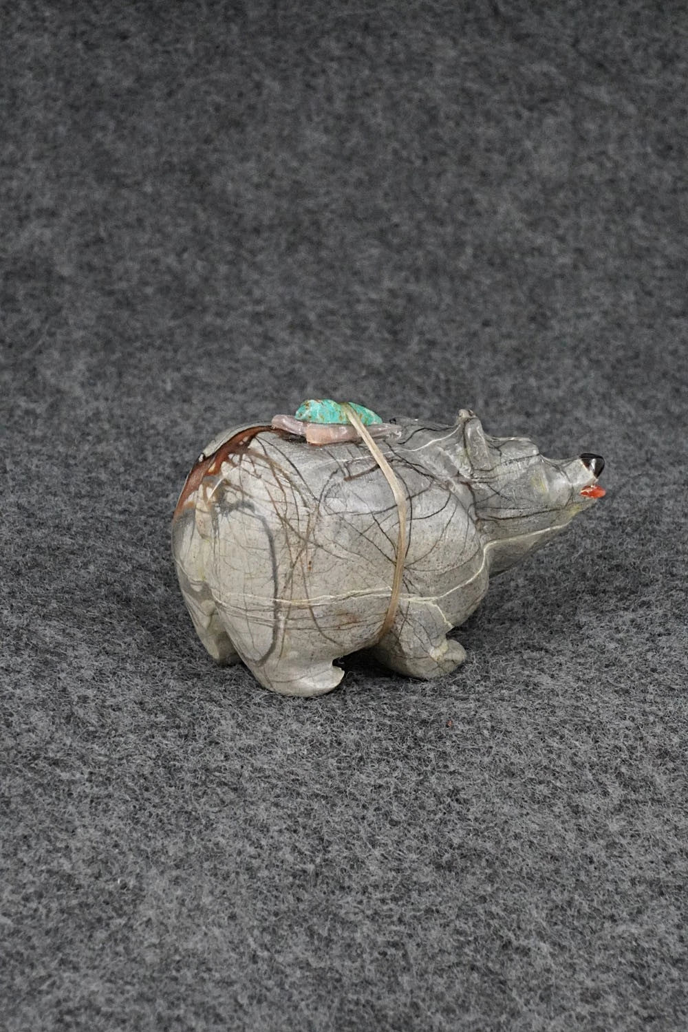 This bear with arrowhead offering Zuni fetish was carved by Freddie Leekya. The bottom is signed FL.