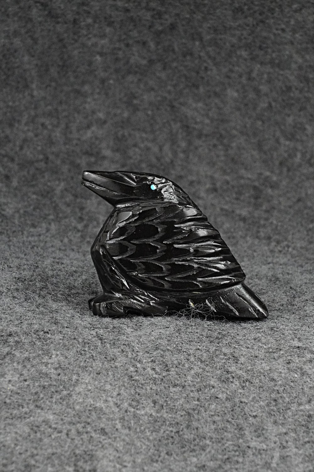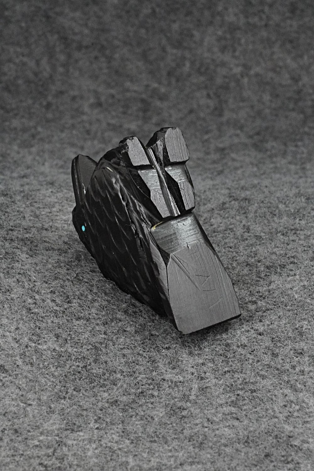 This crow Zuni fetish was carved by Tony Mackel. The bottom is signed TM.
