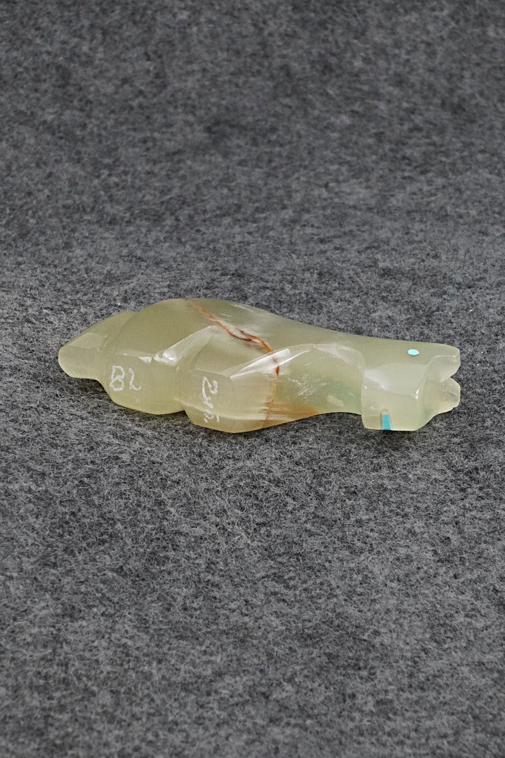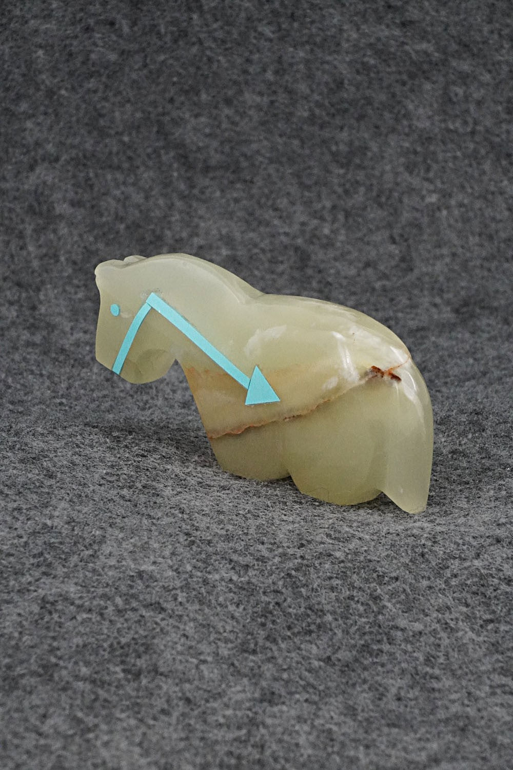 This horse with arrow inlay design Zuni fetish was carved by Bernard Laiwakete. The bottom is signed BL and Zuni.