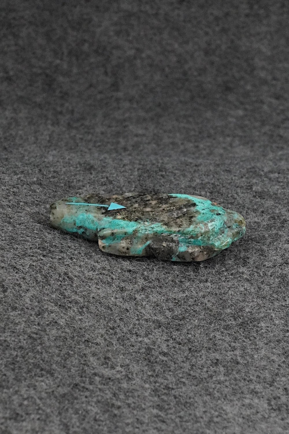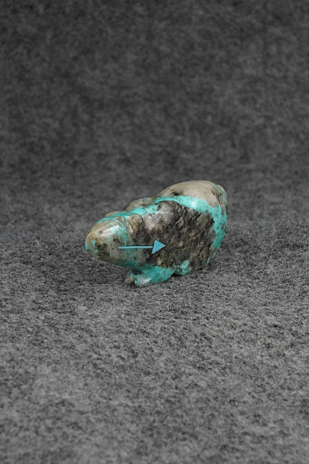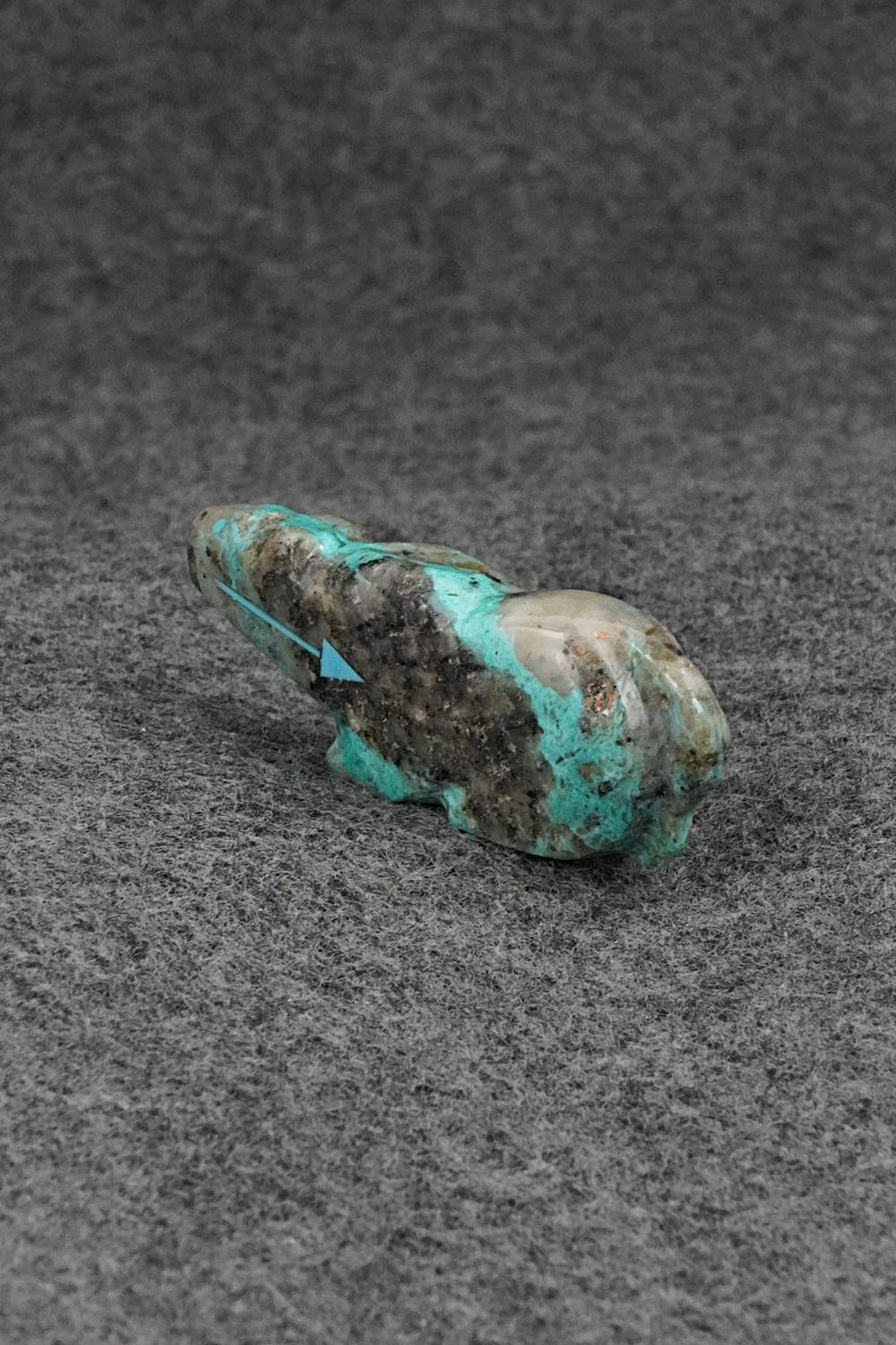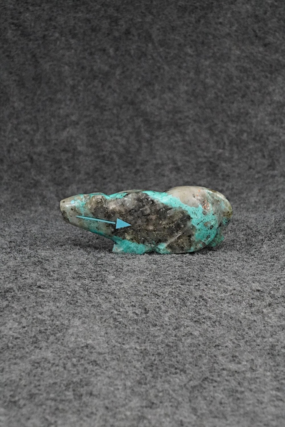 This mountain lion with arrow inlay design Zuni fetish was carved by Abby Quam Panteah. The bottom is signed CAP.
