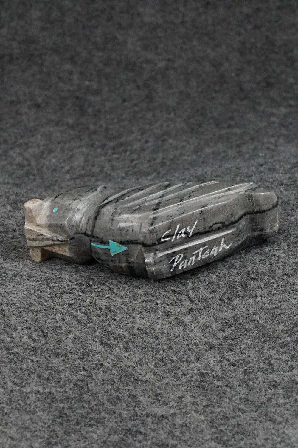 This owl with arrow inlay design Zuni fetish was carved by Clay Panteah. The bottom is signed Clay Panteah.