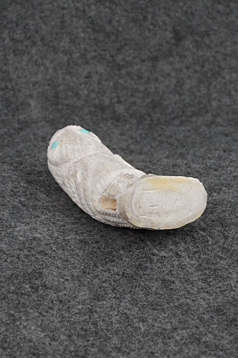 This owl Zuni fetish was carved by Garrick Weeka. The bottom is signed GW and NM.