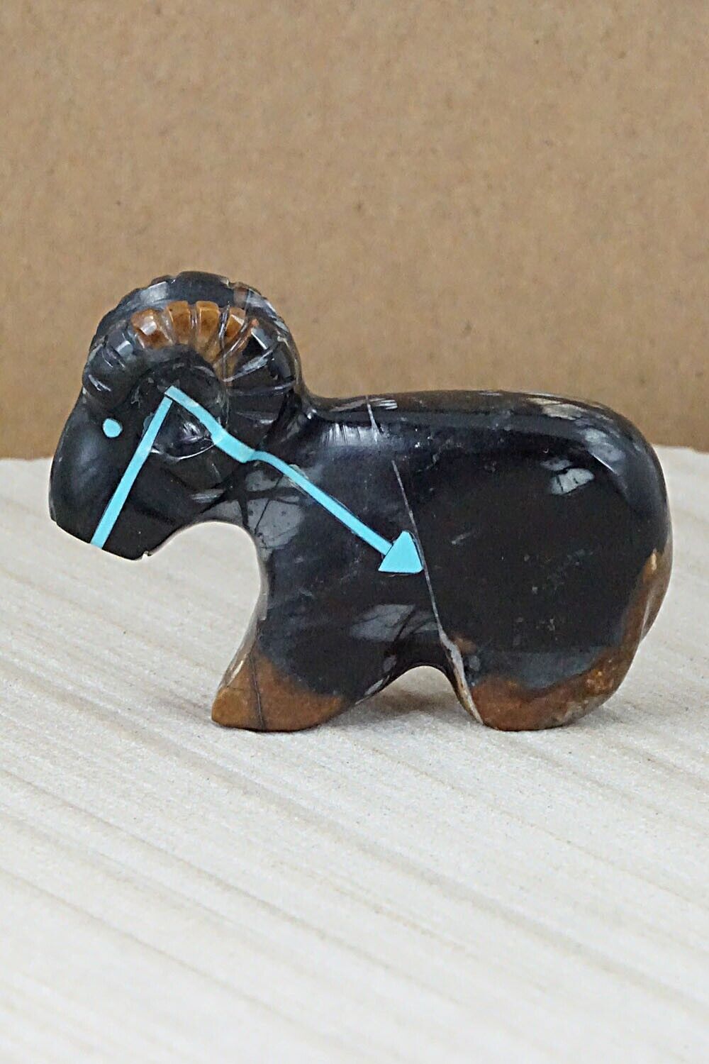 This ram Zuni fetish was carved by Rodney Laiwakete. The bottom is signed.