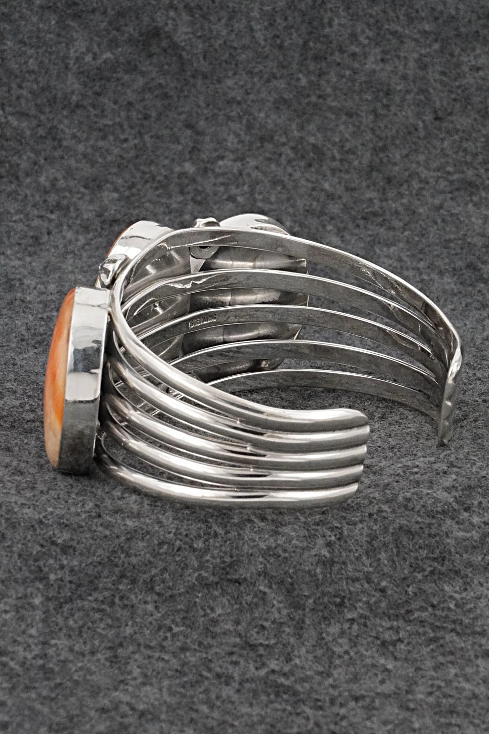 This impressive Spiny Oyster and bright-polish sterling silver bracelet was made by Navajo silversmith Paul Livingston. The back is stamped Paul Livingston and sterling.
