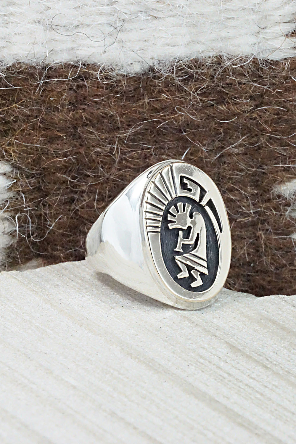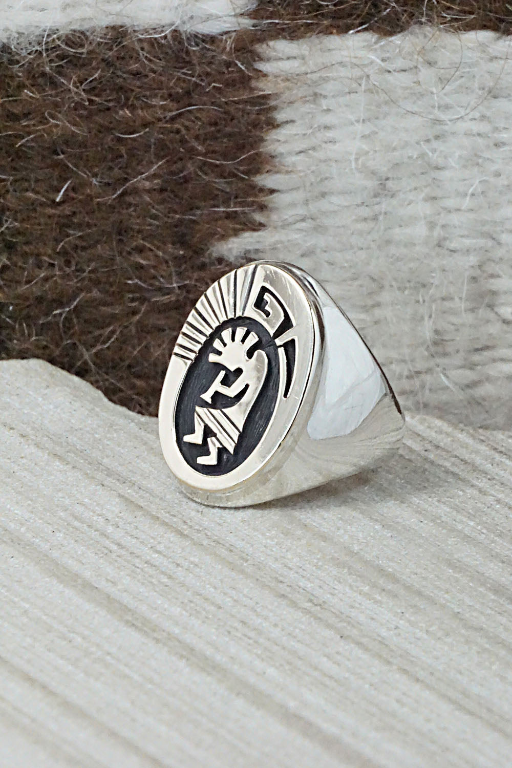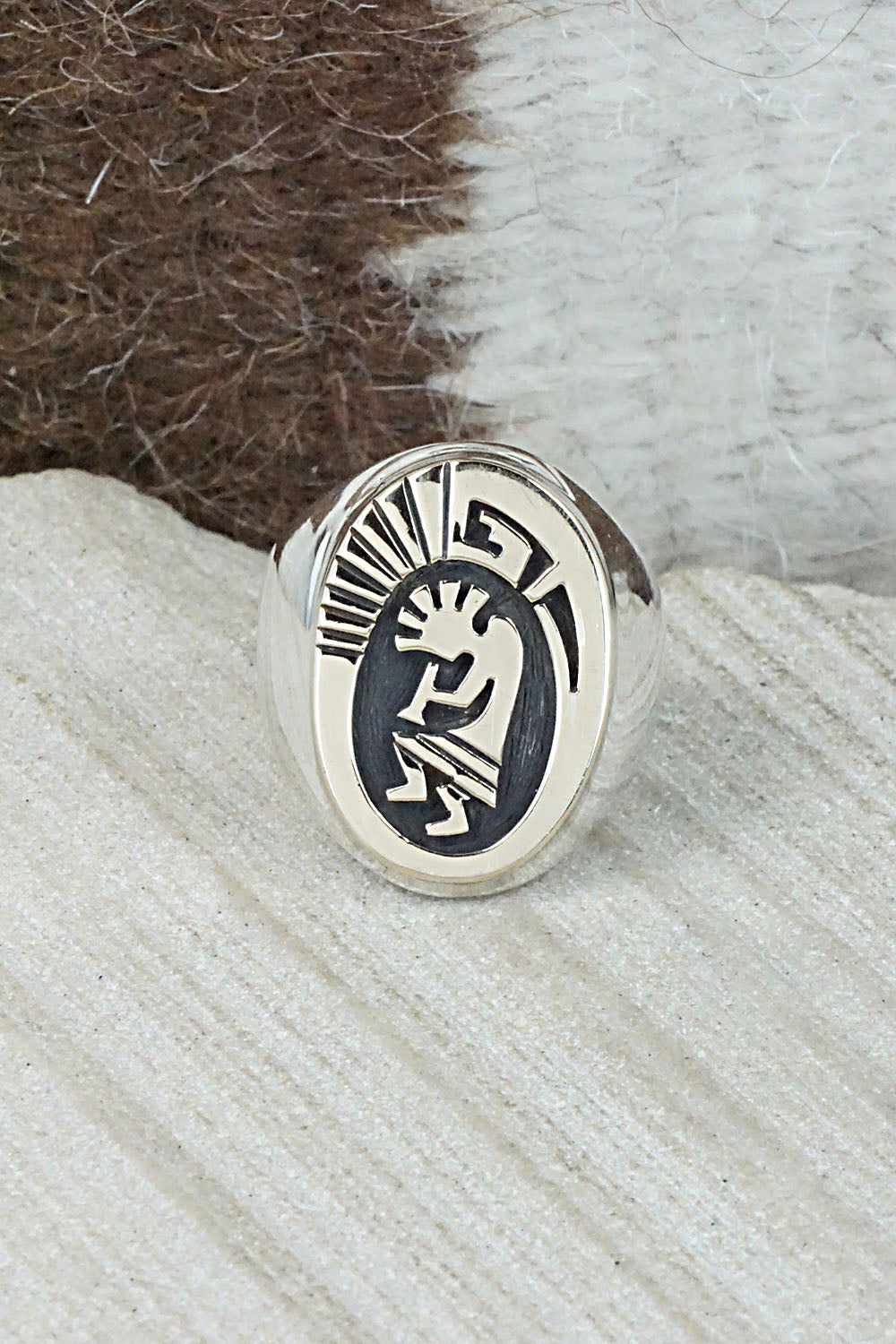 This sterling silver and 14k gold fill Kokopelli ring was made by Navajo silversmith Mike Begay. The inside is stamped 14k and sterling.