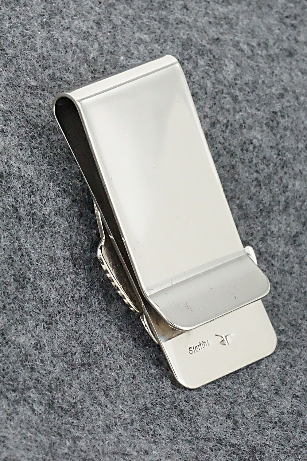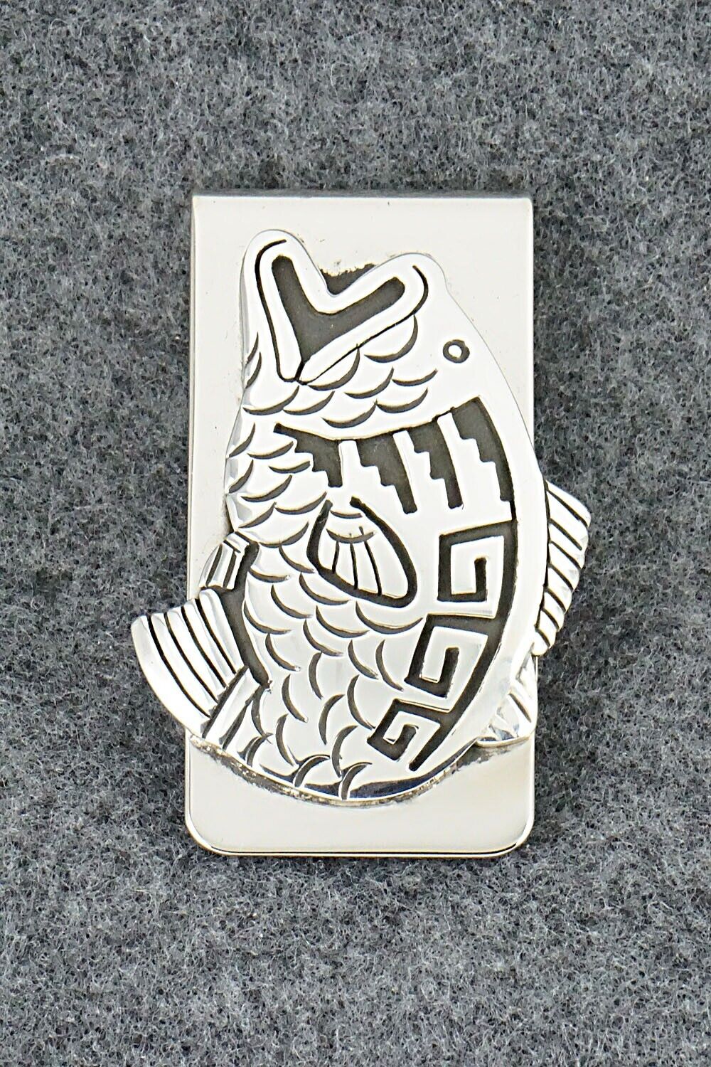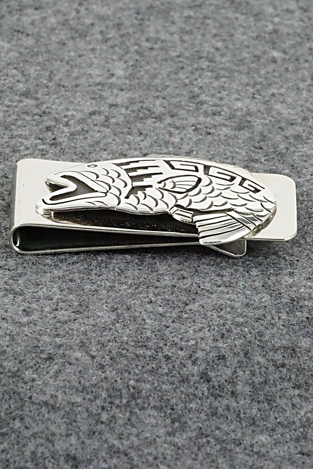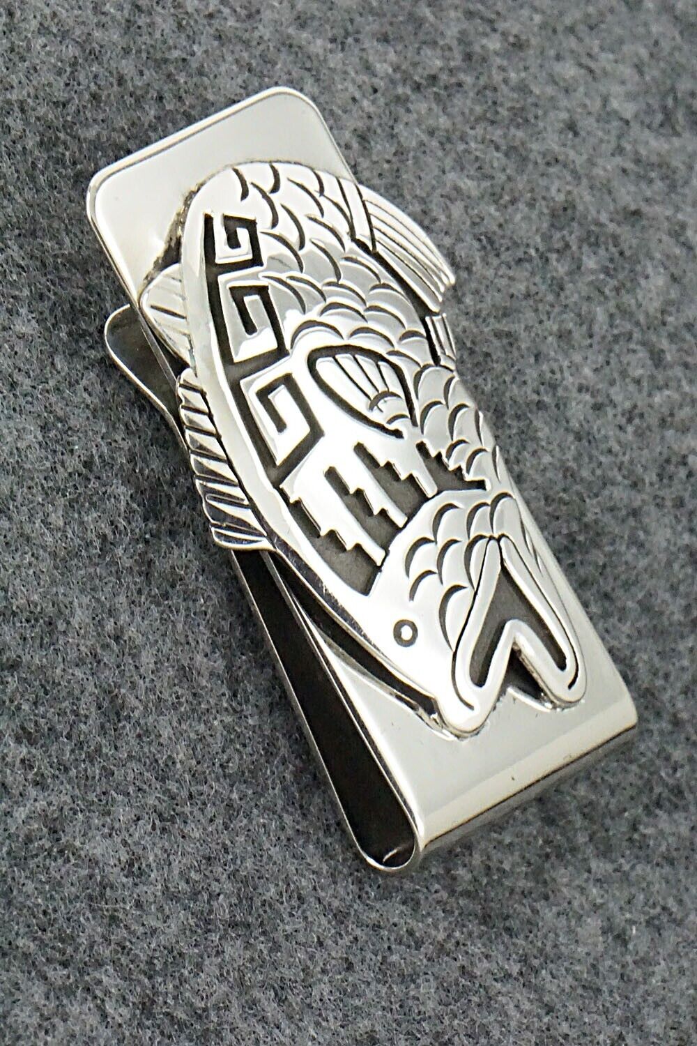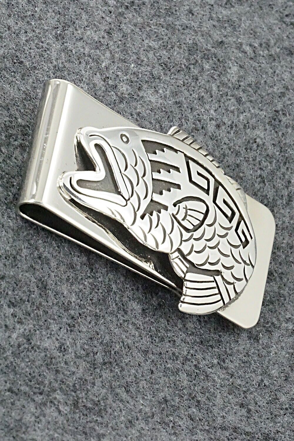 This sterling silver and stainless steel money clip featuring a bass fish was made by Navajo silversmith Sonny Gene. The back is signed and stamped sterling.