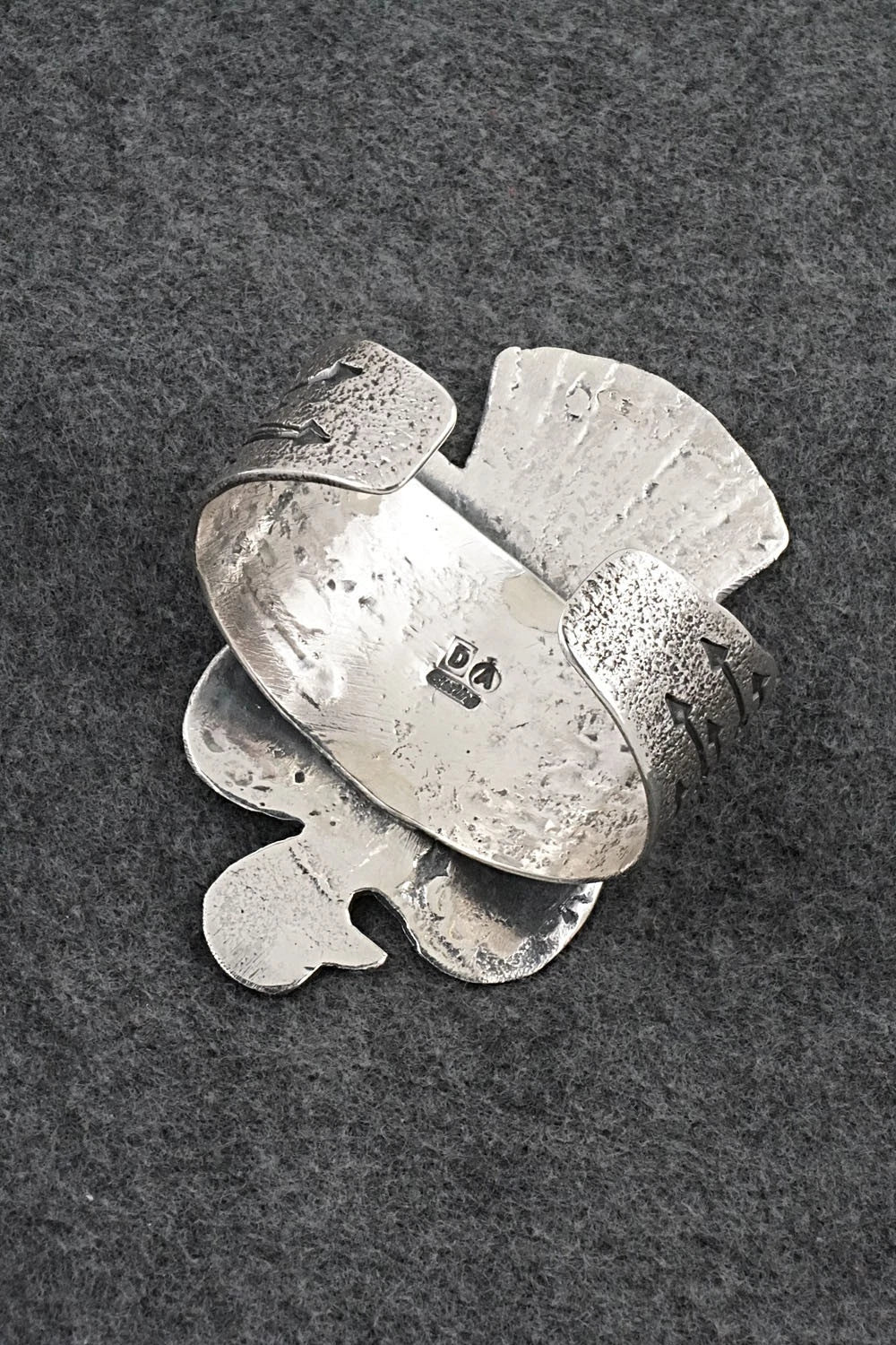 This remarkable turquoise and bright-polish sterling silver bracelet shaped like an eagle was made by Navajo silversmith Delbert Arviso. The back is signed DA and sterling.