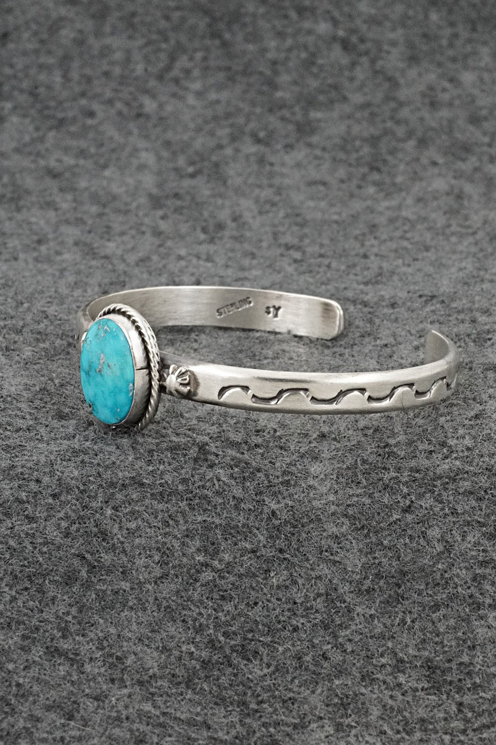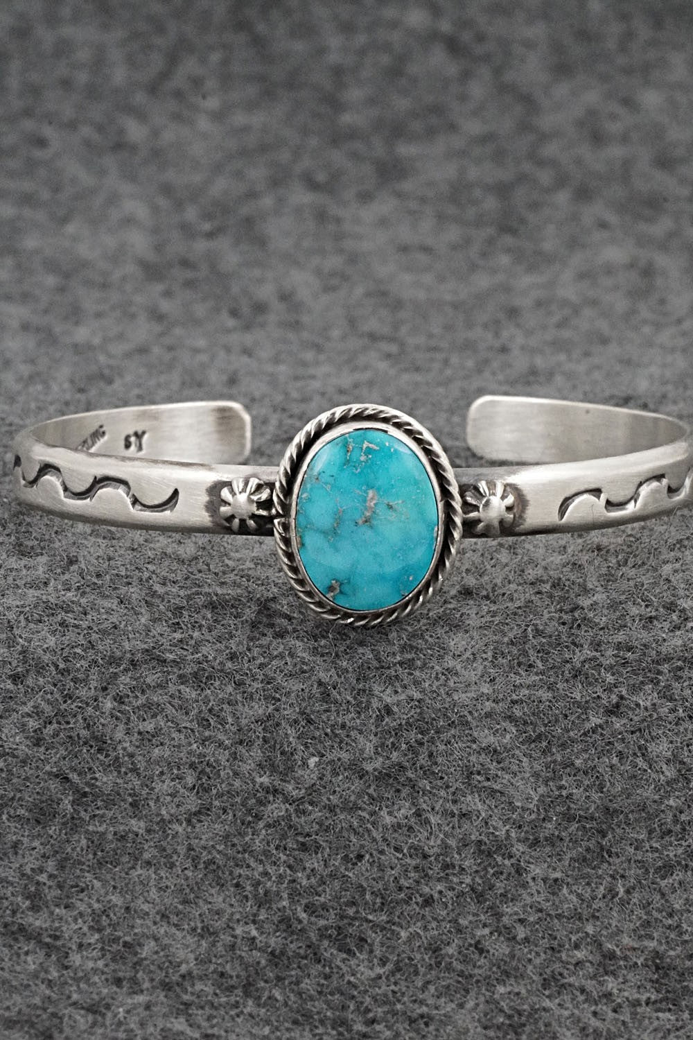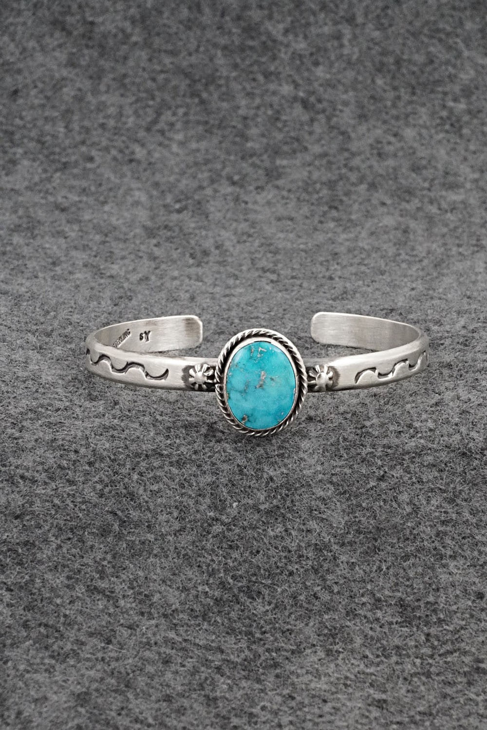 This Kingman turquoise and brushed-finish sterling silver bracelet was made by Navajo silversmith Samuel Yellowhair. The back is signed SY and stamped sterling.
