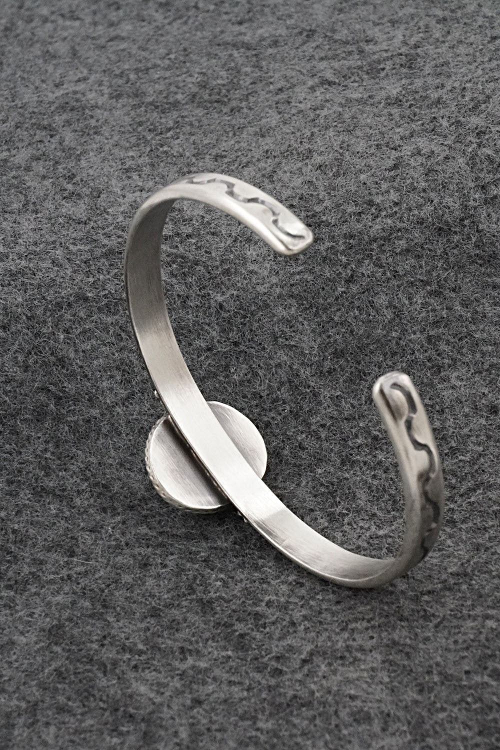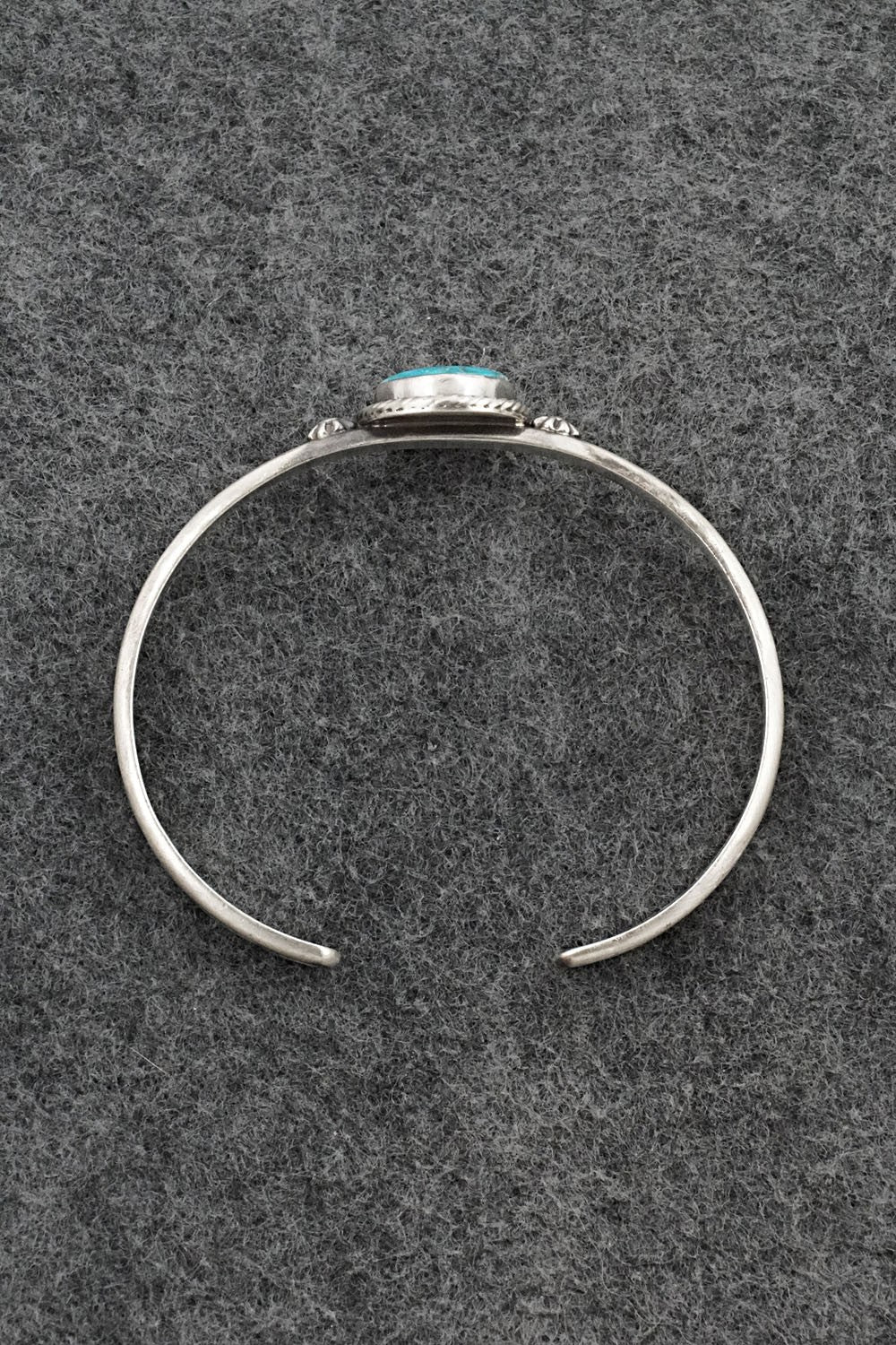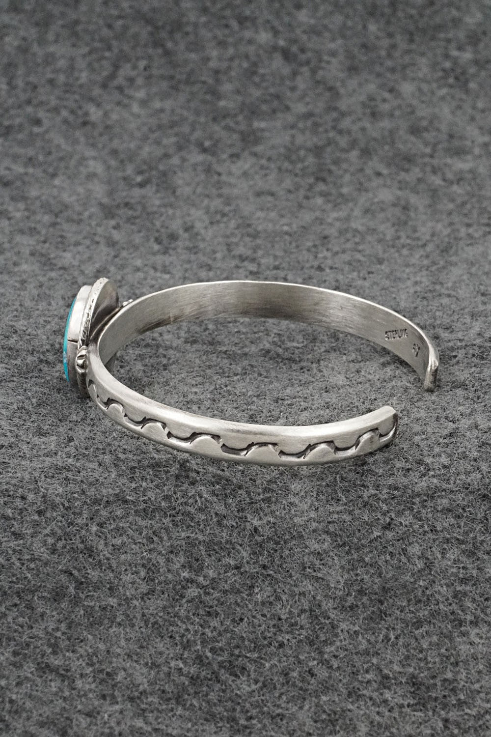 This Kingman turquoise and brushed-finish sterling silver bracelet was made by Navajo silversmith Samuel Yellowhair. The back is signed SY and stamped sterling.